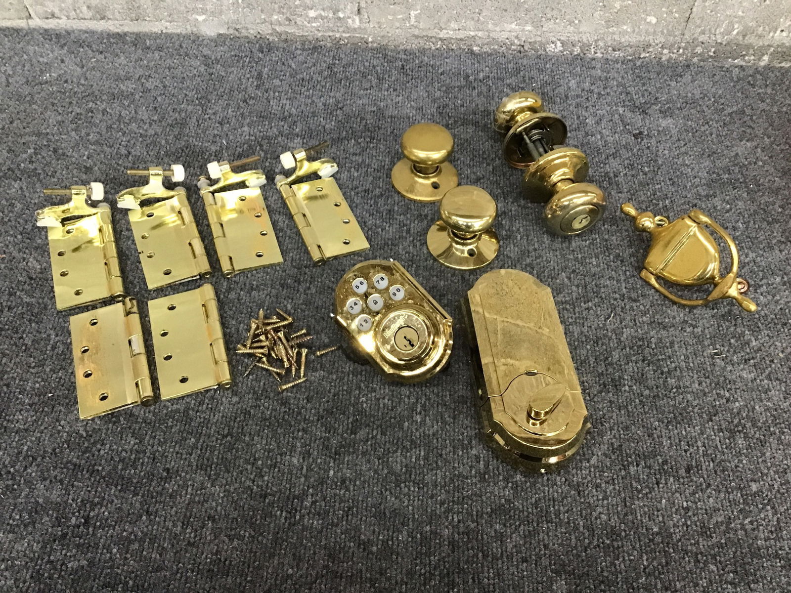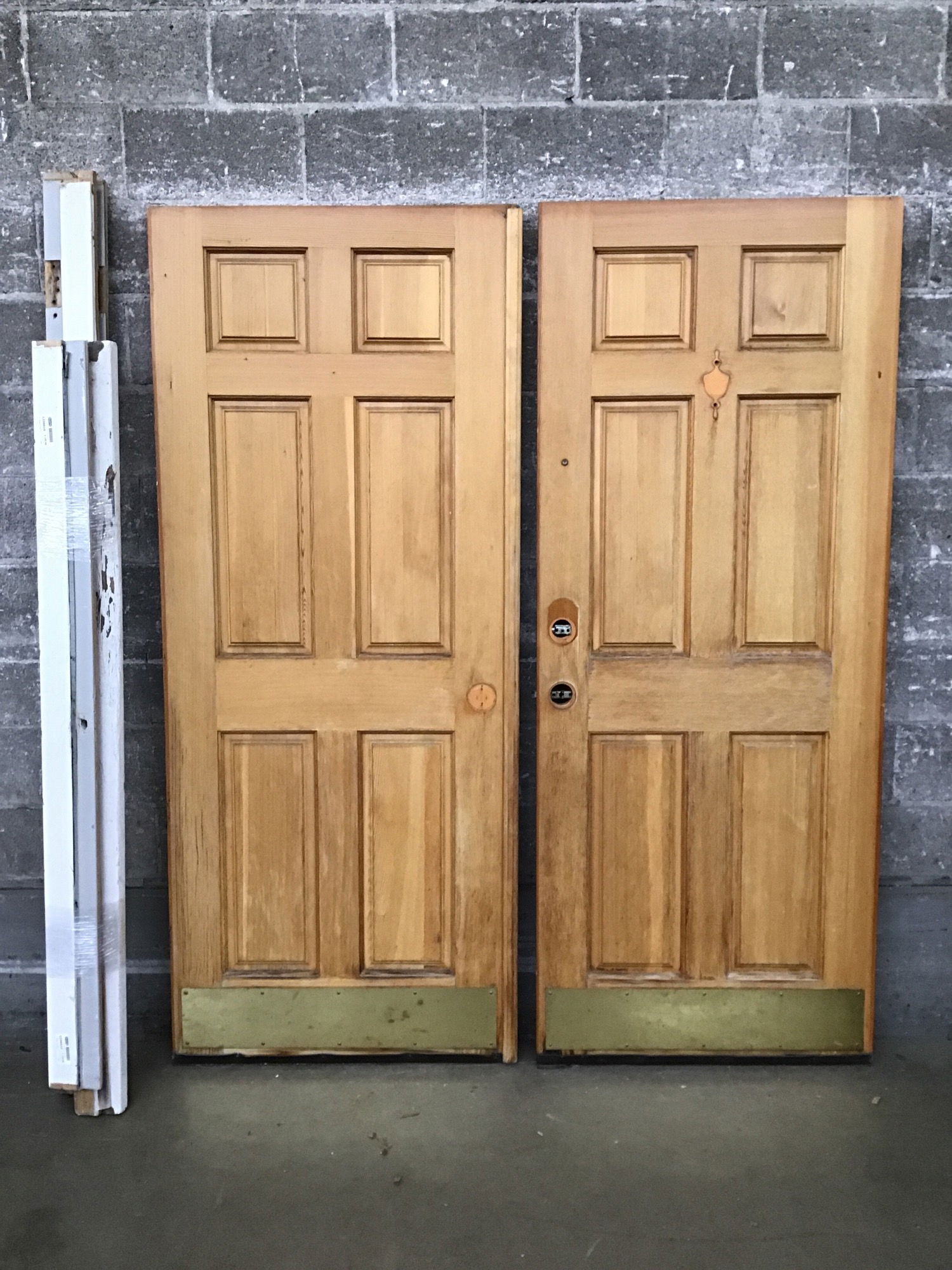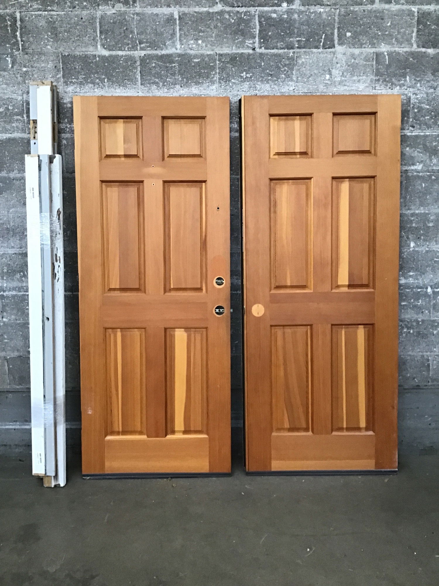 Exterior CVG fir double door set with a jamb that's been wrapped up for rehanging. These guys come with hardware, including hinges, handleset and a pair of dummy knobs, and electronic deadbolt system. One door has a knocker on exterior side and a peephole.