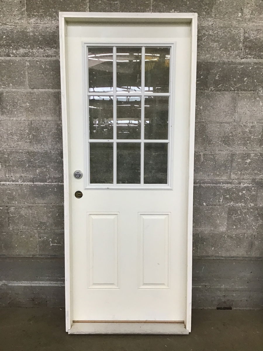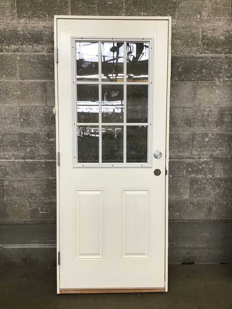 Clean steel clad exterior half-lite door in good shape, has a noticeable paint job-a little sloppy but won't affect function.
