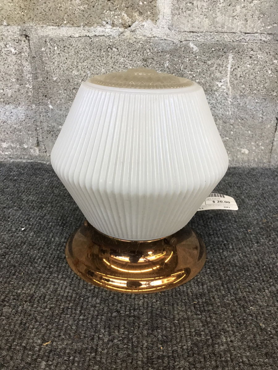 More modern ceiling light fixture with an angled, two-tone shade with a fluted surface and bright coppery fitter.