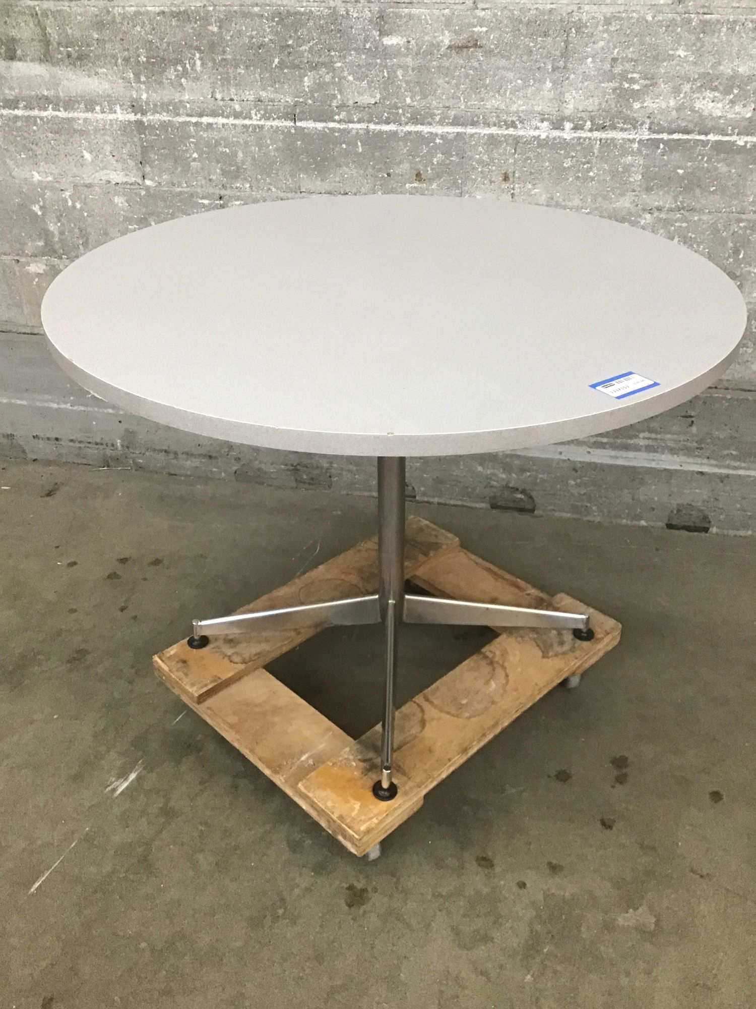 Classic round cafe table with a speckled grey top and stainless base.