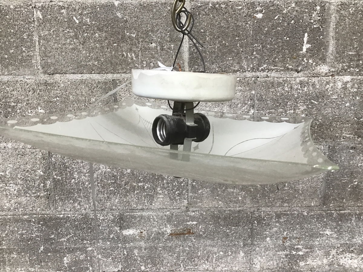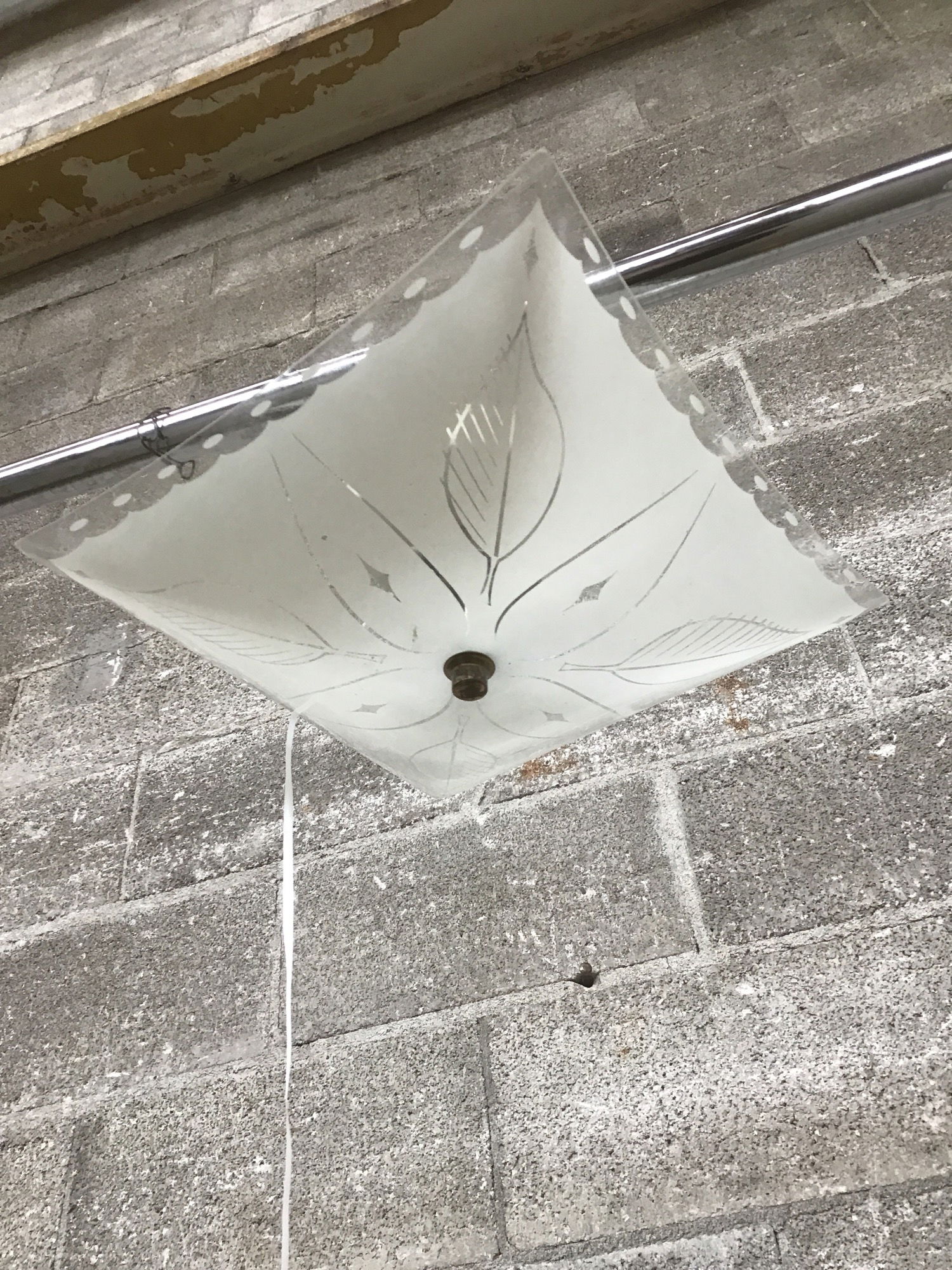 Semi flush ceiling light with a square glass shade and cool leaf pattern.