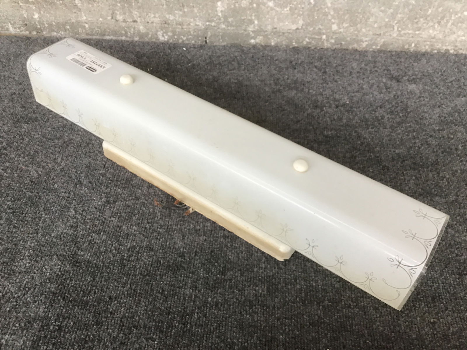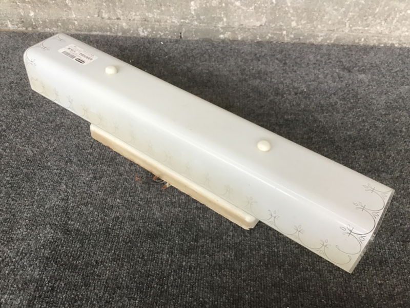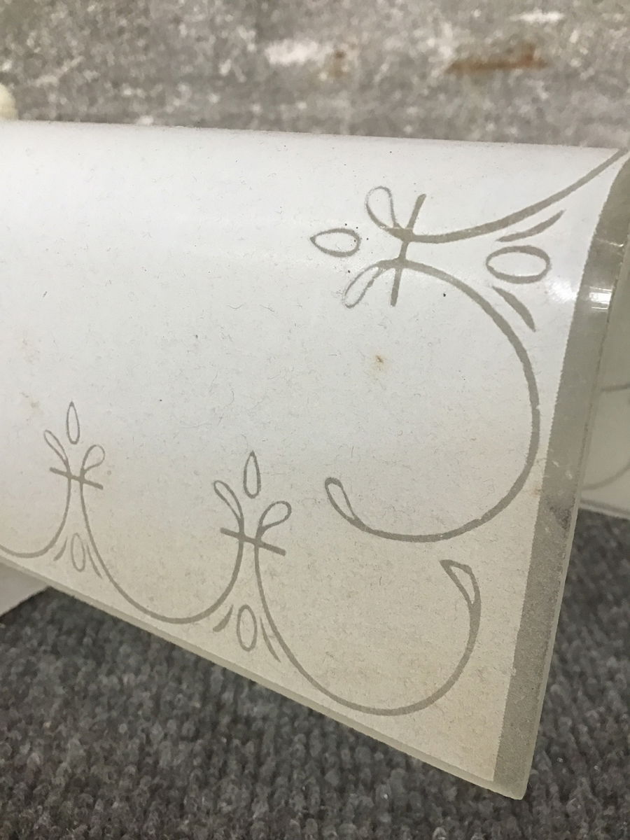 Vintage bathroom sconce with a glass shade that has a subtle decorative border. This one may need to be rewired. If you’d like to get this light fixture rewired here at Second Use, please check out our in-house Lighting Services.