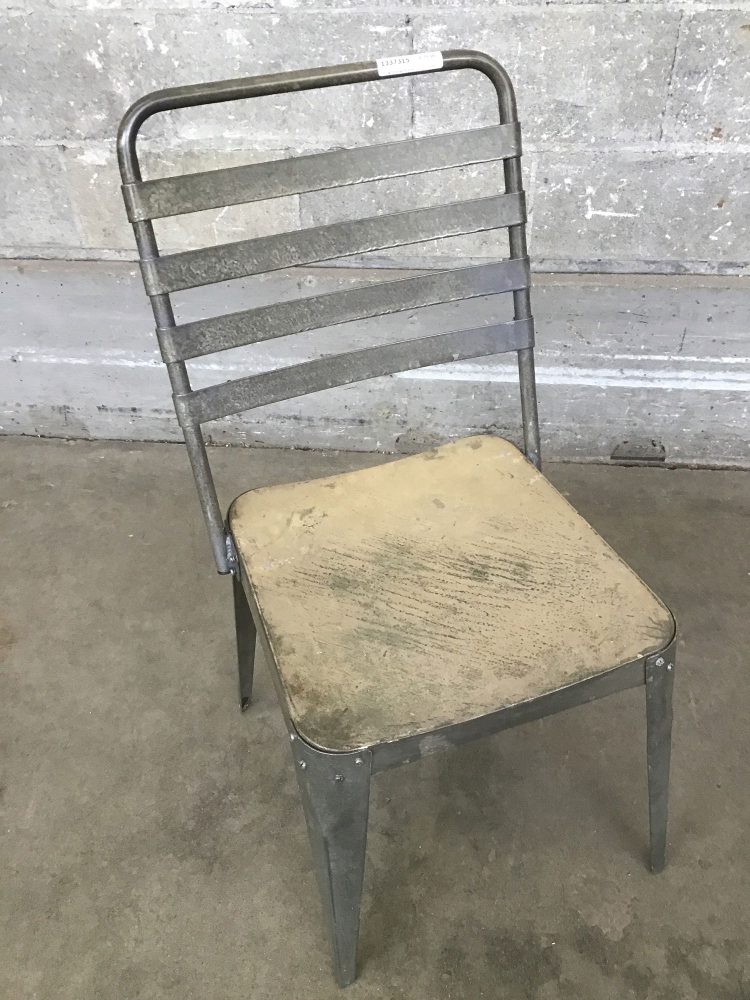 The edgier cousin of your classic industrial chic cafe chair, this steel chair offers a wider seat, slatted back & sweet greenish painted patina that won't leave oxidation residue on the seat of your pants. Seat height measures 17.75". Photo may be representational.