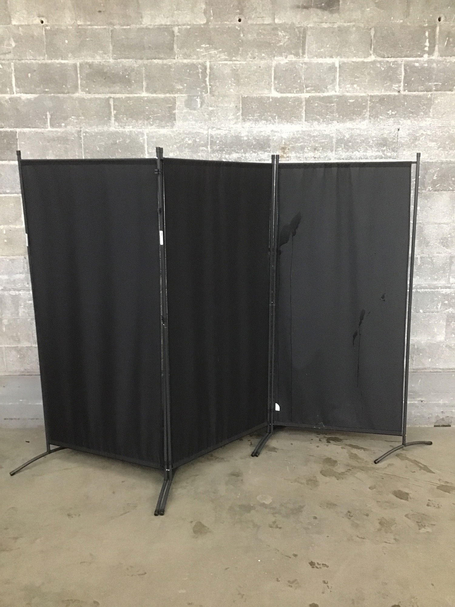 This is a trio of sheets of black nylon that are attached to a tube steel frame. Stands on two feet. Dimensions are for one panel.