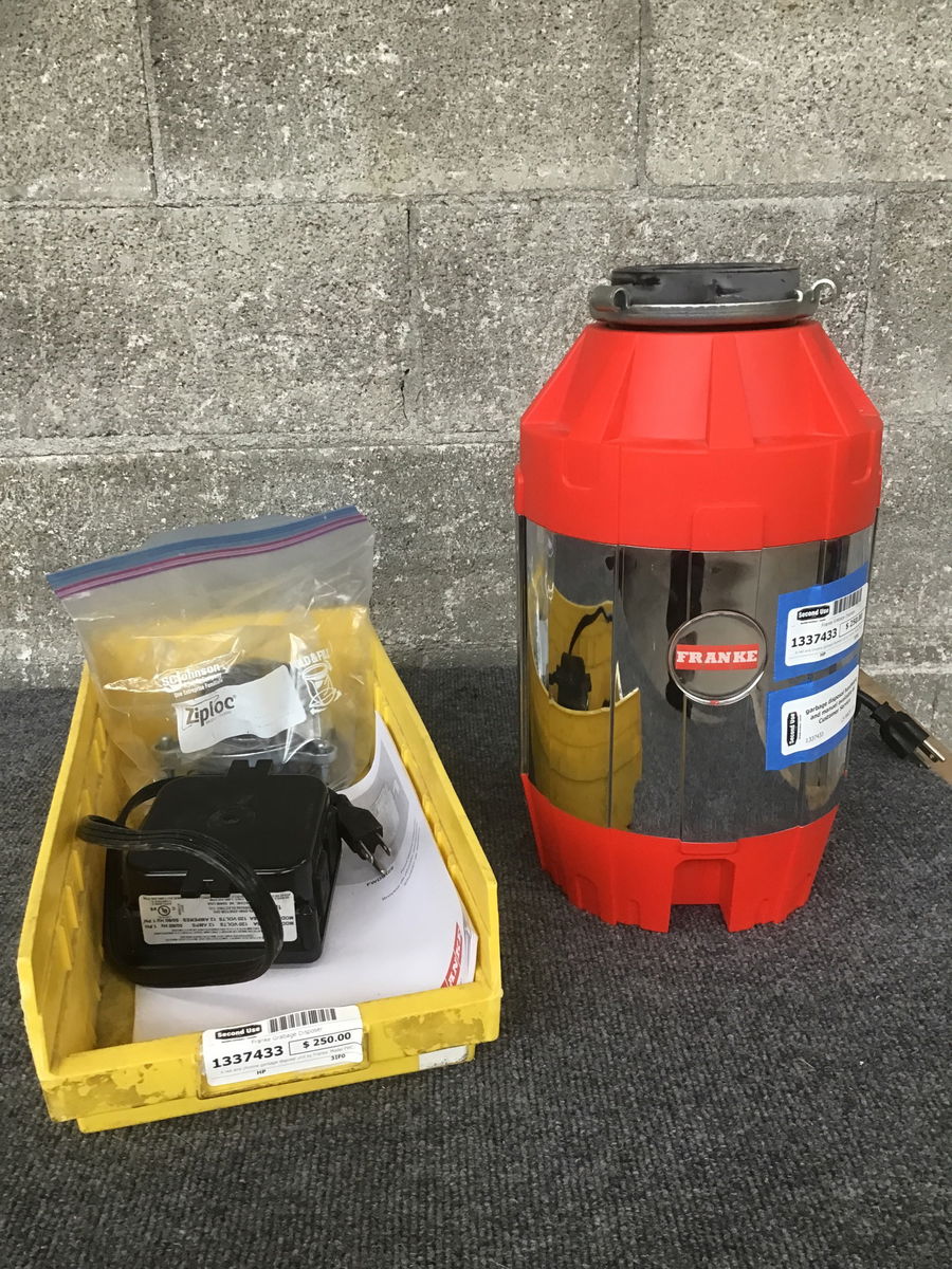 A red and chrome garbage disposal unit by Franke. Model FWDJ125. Tested in house and seems to be very functional; it runs very quite too! Includes metal cap, switch and a manual. This looks to retail new at $549.