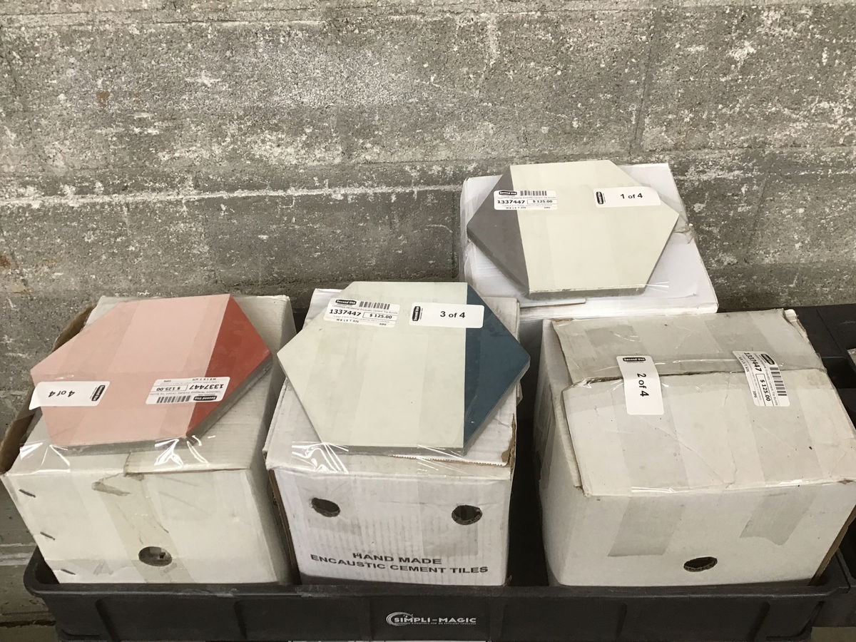 4 boxes of 8x9in encaustic cement hex tiles in 3 colorblock shade variants - 2 boxes of white/gray, 1 box + bonus terracotta/blush, and 1 box of denim/white. 50 tiles for a total coverage of about 18sqft. Enough to give a smaller bathroom or foyer a fresh and contemporary makeover! Similar tiles retail at $5 and up per piece.