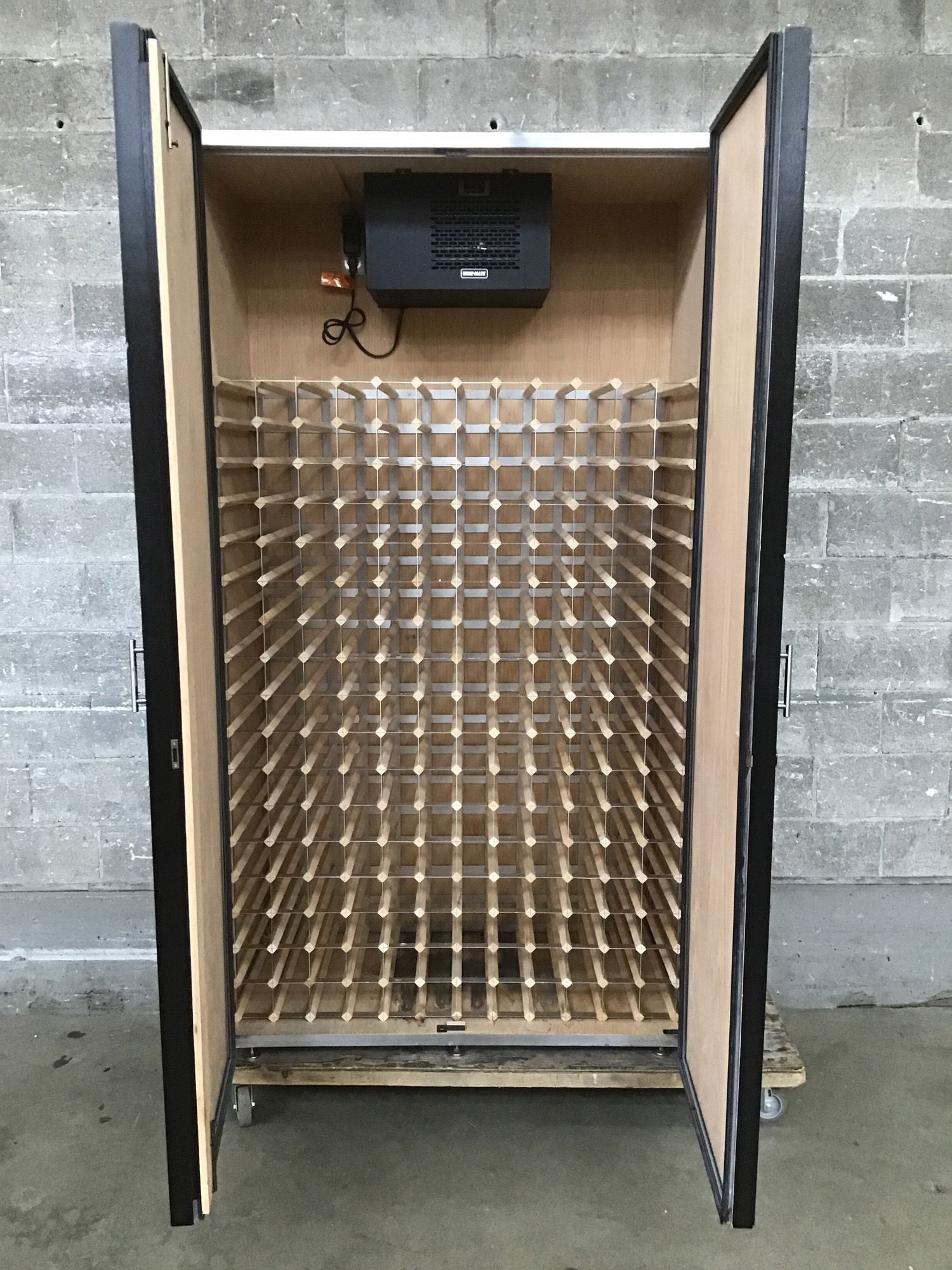 This is a huge, self-contained wine cellar cabinet made by VinoTemp who specializes in custom wine storage solutions. This features wine storage for around 400 bottles of wine, a Wine-Mate climate control system, a built-in LED light strip, and raw oak interior. The exterior is also oak but it is painted entirely black. If you have ever wanted a wine cellar but don't have the money or the space, this is the solution for you!