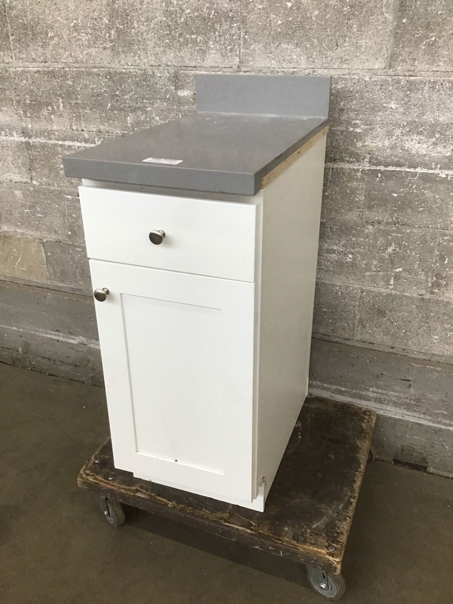 This is a smaller base cabinet with a coat of white paint, shaker panel door, brushed nickel hardware, and a grey stone countertop with the backsplash attached, kinda.