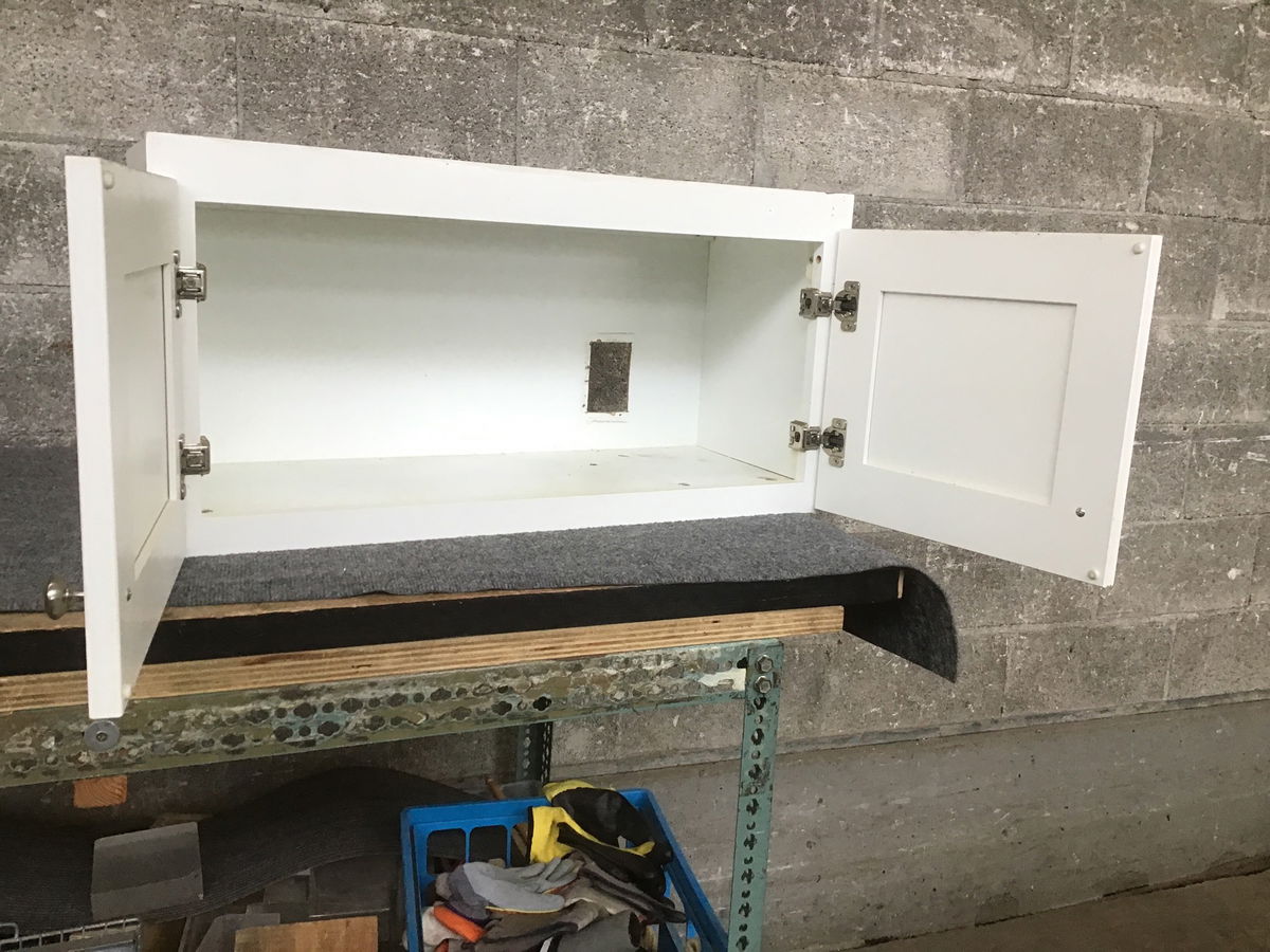 Shaker Upper Cabinet with two doors and brushed nickel hardware. Has a cutout for an outlet in the backside.