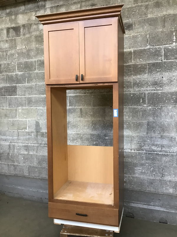Alder Double Wall Oven Cabinet with a mocha stain on the alder face. Has two doors and one drawer at the bottom. See other items on this job for the wall oven that went inside this cabinet.