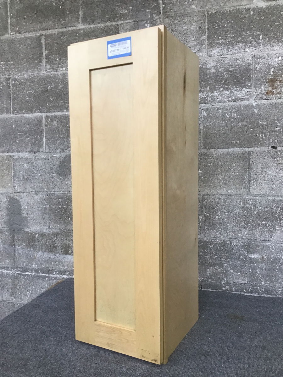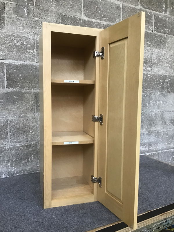 This clear finished maple, Shaker style face wall cabinet has a 1/2" plywood cabinet box and is very clean.