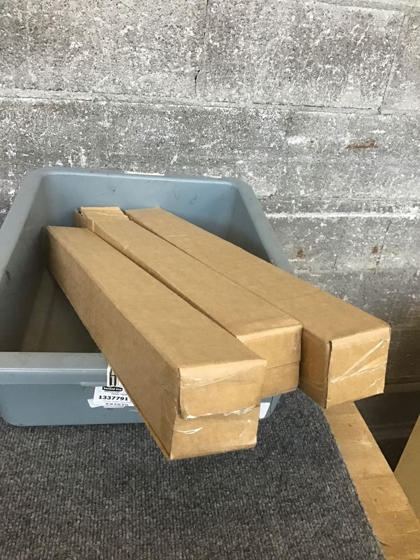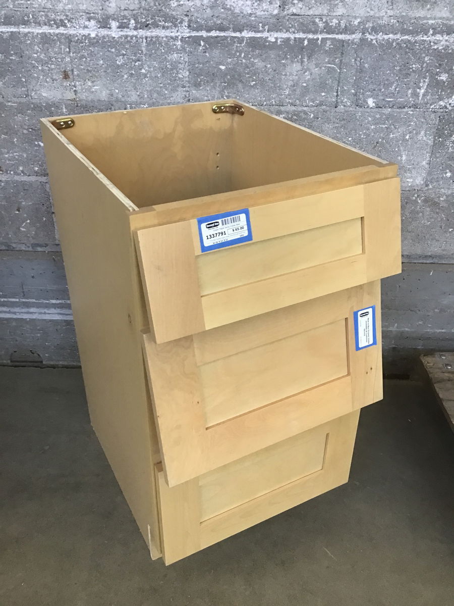 This clear finished maple, Shaker style face open shelf drawer bank has a 1/2" plywood cabinet box and is very clean. The full extension drawer glides are still in their original boxes and are available at Customer Service counter. Photo may be representational.