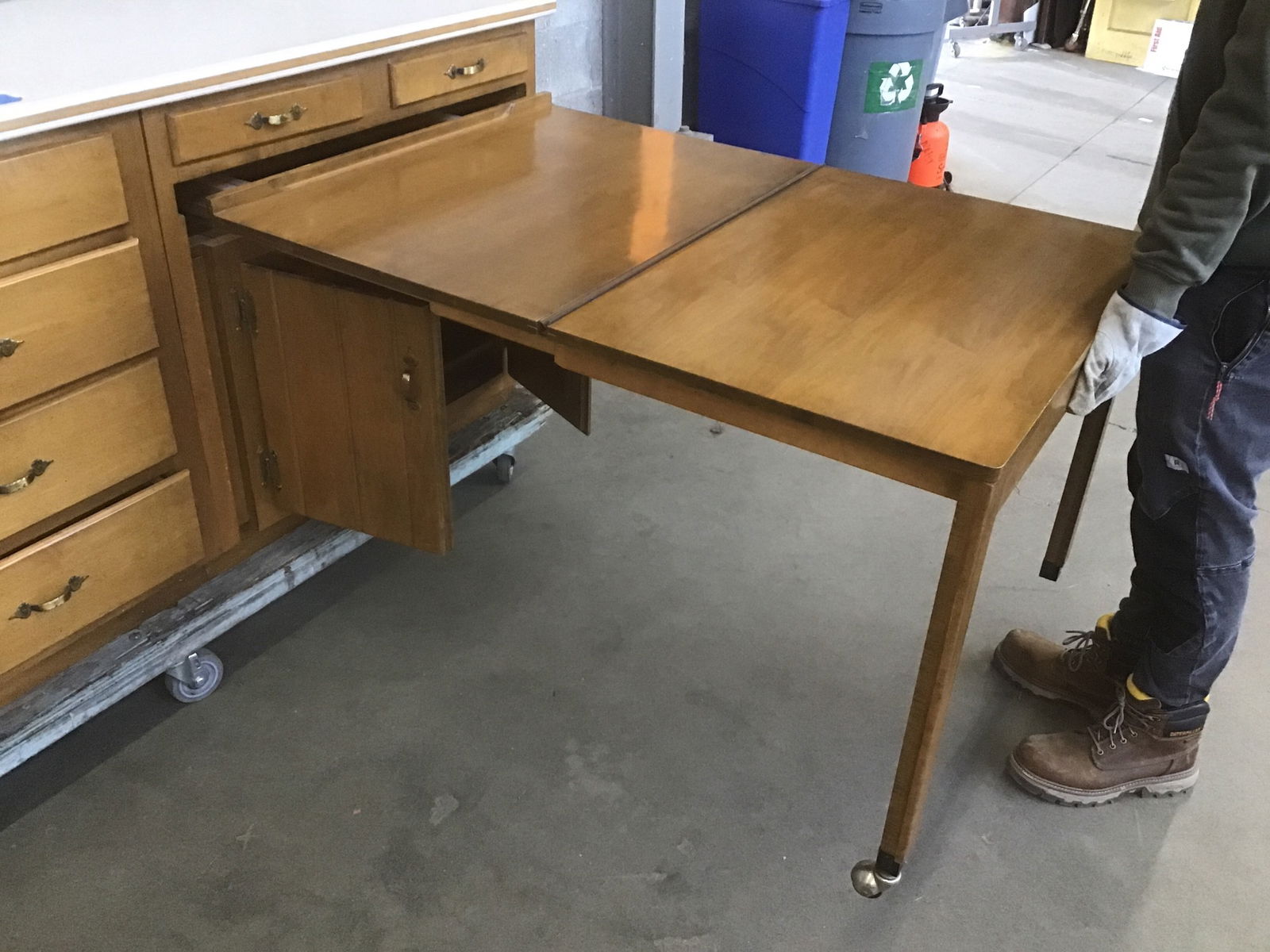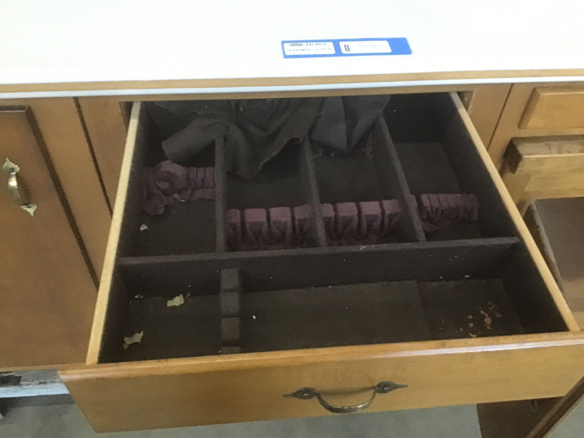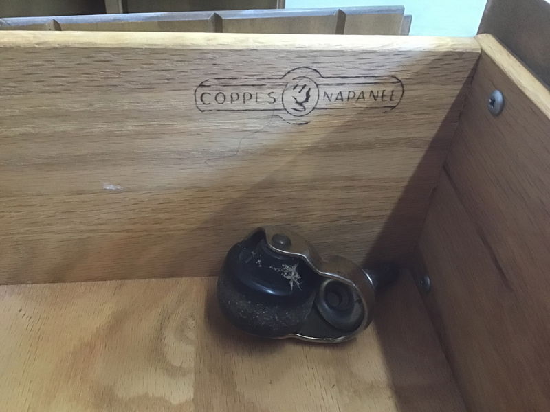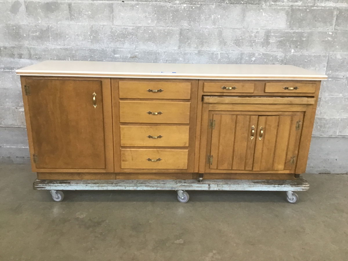 Set of 3 base cabinets with a stained and mottled maple finish. It has Corian countertop with a wood strip inlay on the front edge. One cabinet has 2 pull-out drawers. The middle Cabinet has a felt lined top drawer. The rightmost cabinet has a pull-out table that folds out with a leaf and has 2 casters on the table legs. The hardware is a hammered bronze common with farmhouse style. Manufactured by Coppes Napanee, a historic cabinet maker out of Napanee, Indiana.