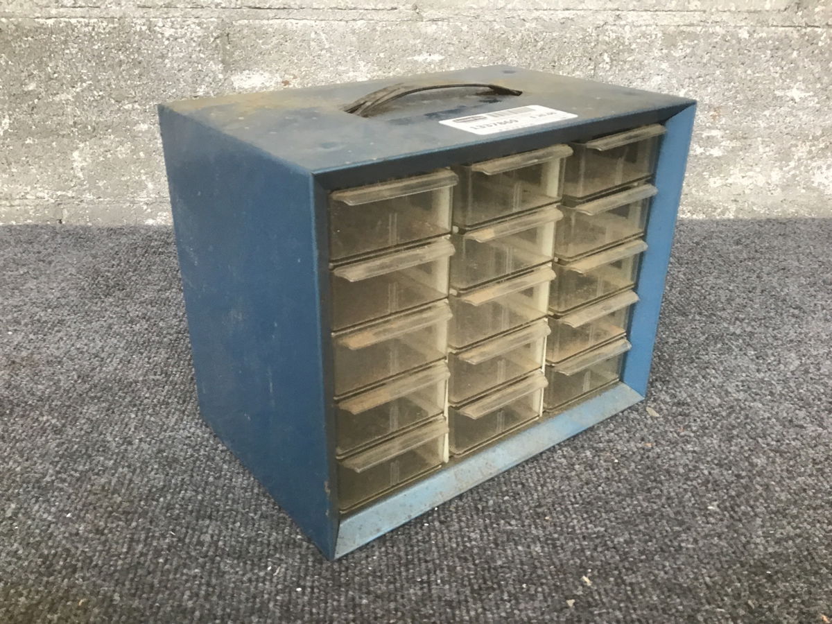 small metal parts cabinet with 15 clear plastic drawers and some clear plastic drawer dividers