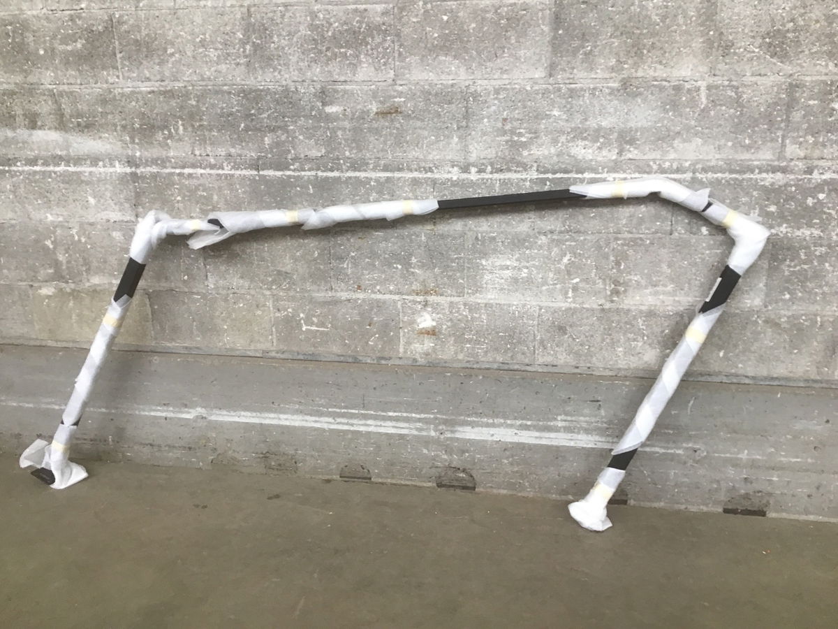 Steel stair railing that's still in its wrapping from it paint or powder coating job. Length listed is outside of 3" square foot to opposite outside foot. Item may have cosmetic damage. Photo may be representational.