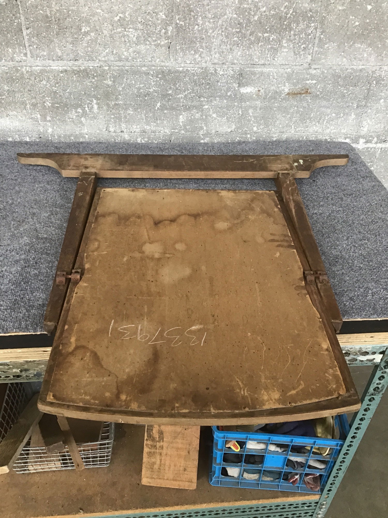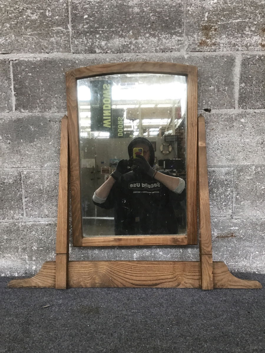 A cute li'l mirror with a slight arch to the top, framed in oak. It's held in the arm brackets of an old vanity desk, although it has since lost the desk part- just the vanity, now. It's pretty flush and easy to remove, so you could mount the bracket arms to your wall for a hanging mirror.