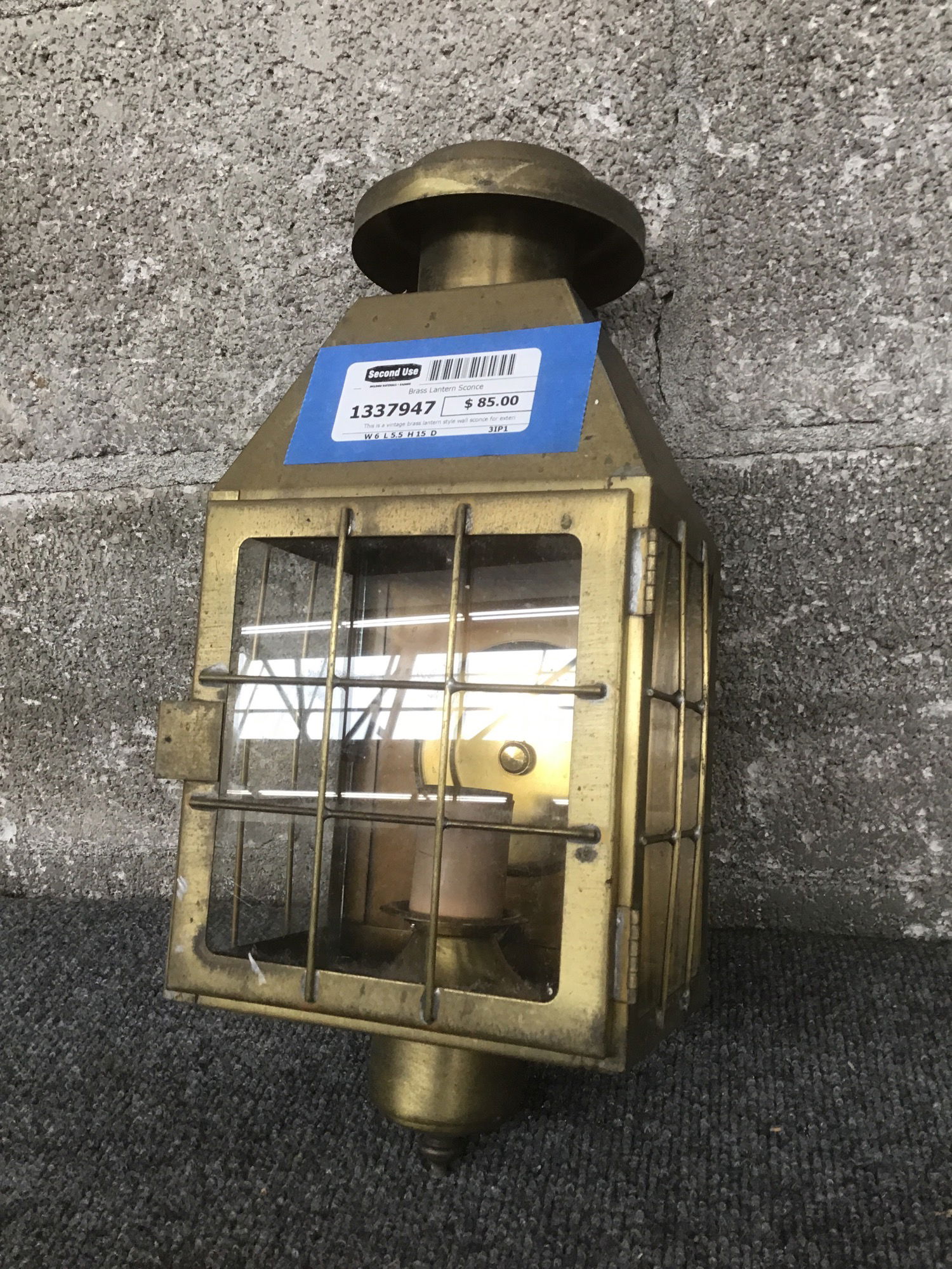 This is a vintage brass lantern style wall sconce for exterior use, but you could totally use them inside, there are no rules. Features 3 sides with glass that have brass grids protecting them. Has a natural patina from being outside.