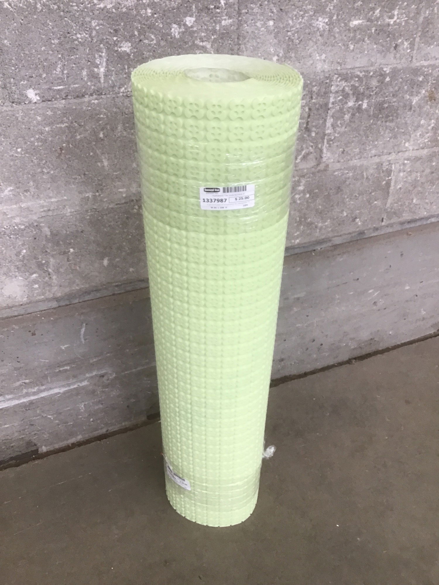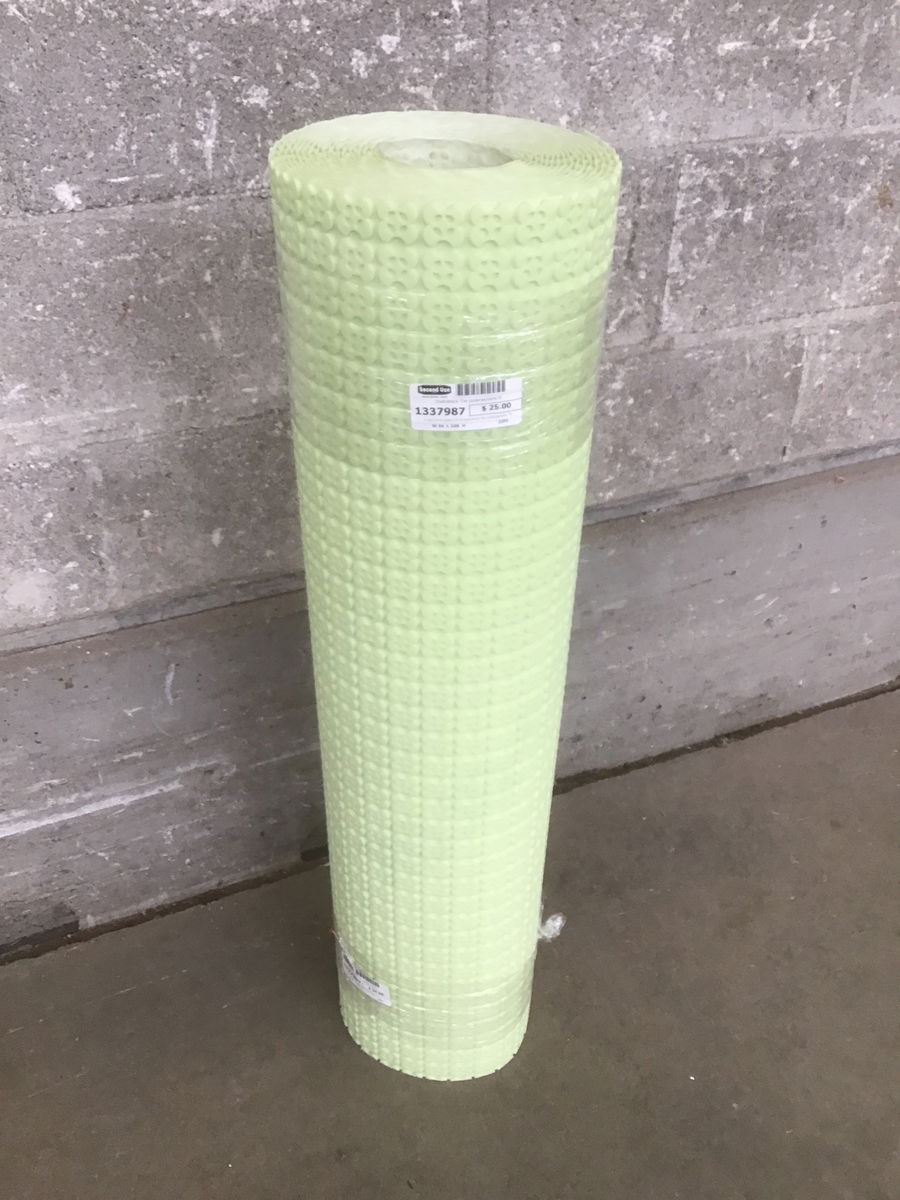 A light slime green roll of Hydroblock tile underlayment. There appears to be roughly 9' of material in total length.