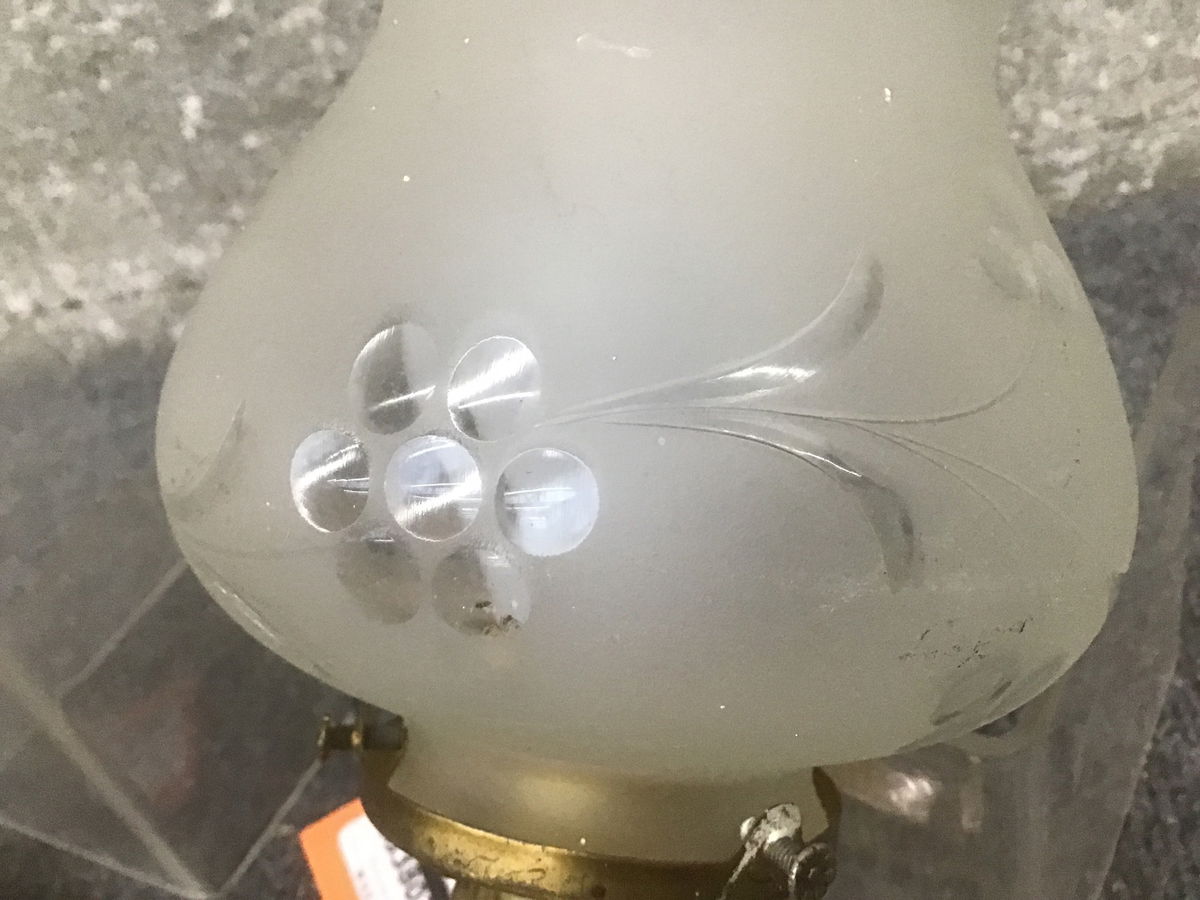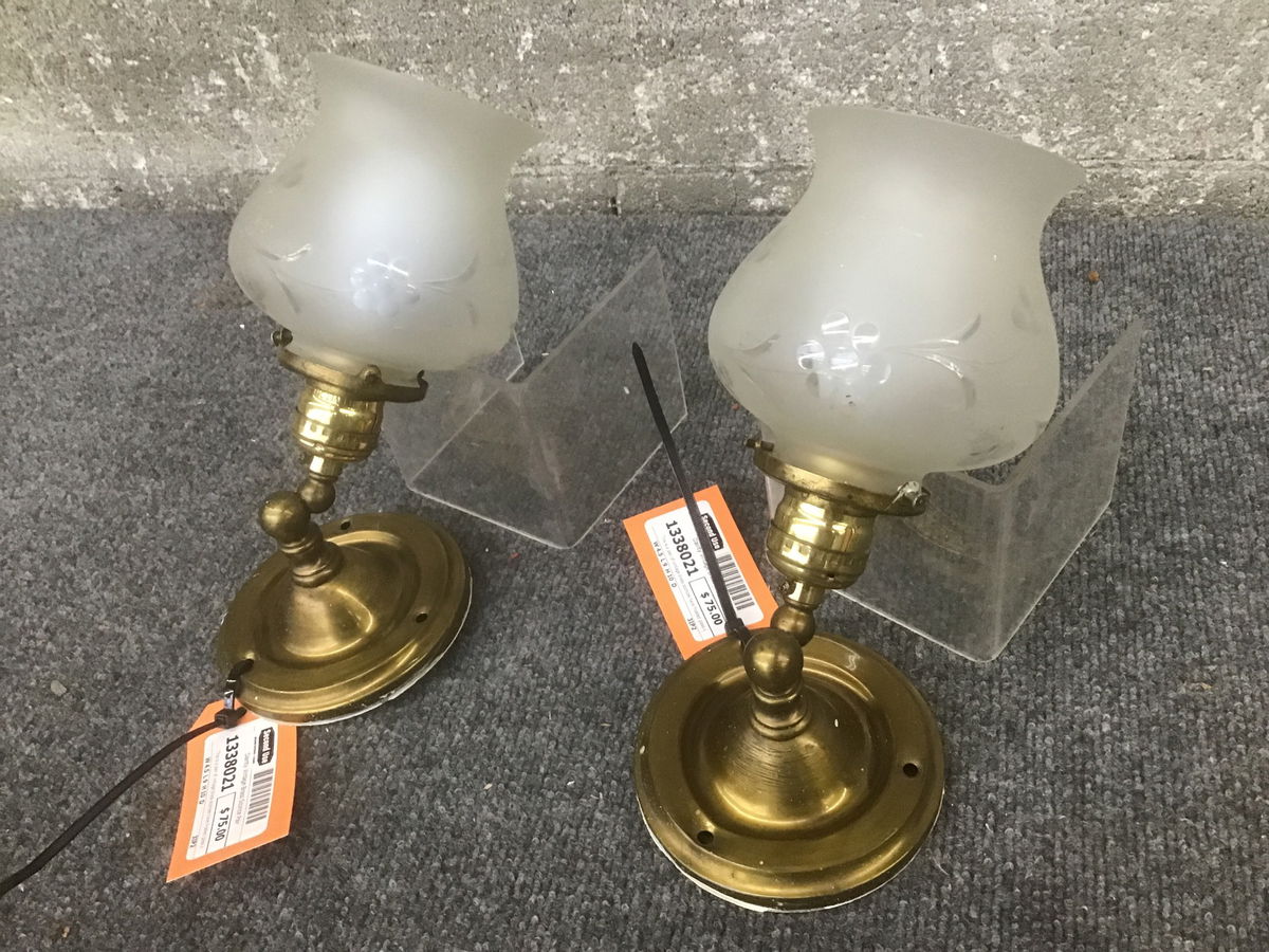 This is a pair of vintage brass sconces have frosted glass shades with what looks be grapes or berries, who is to know? These sconces, when mounted, point out from the wall at an angle.