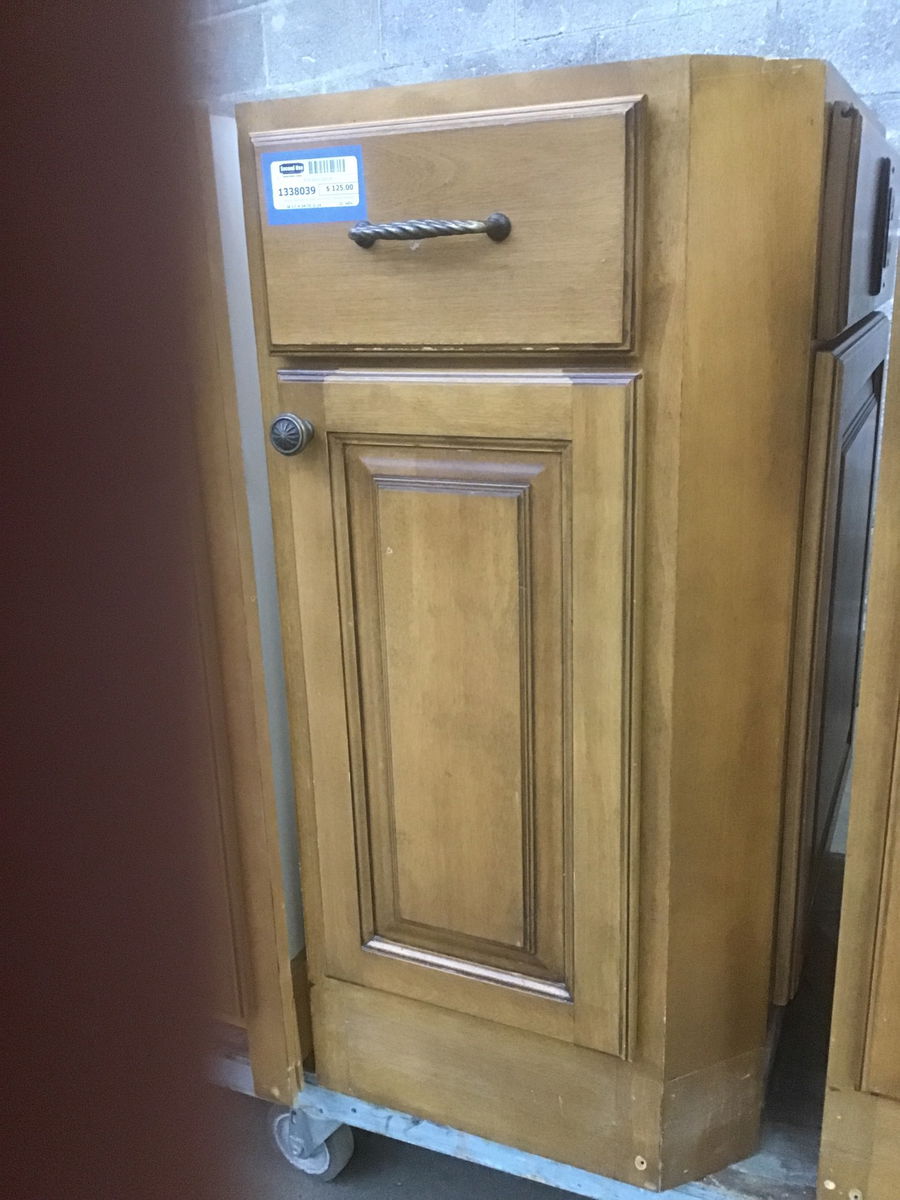 Medium dark stained, raised panel birch (I believe) base cabinet. This one has an angled face to a finished right edge, which has an electrical outlet installed in it. There are baking sheet dividers behind the door. Width listed is approximate and includes outlet cover.