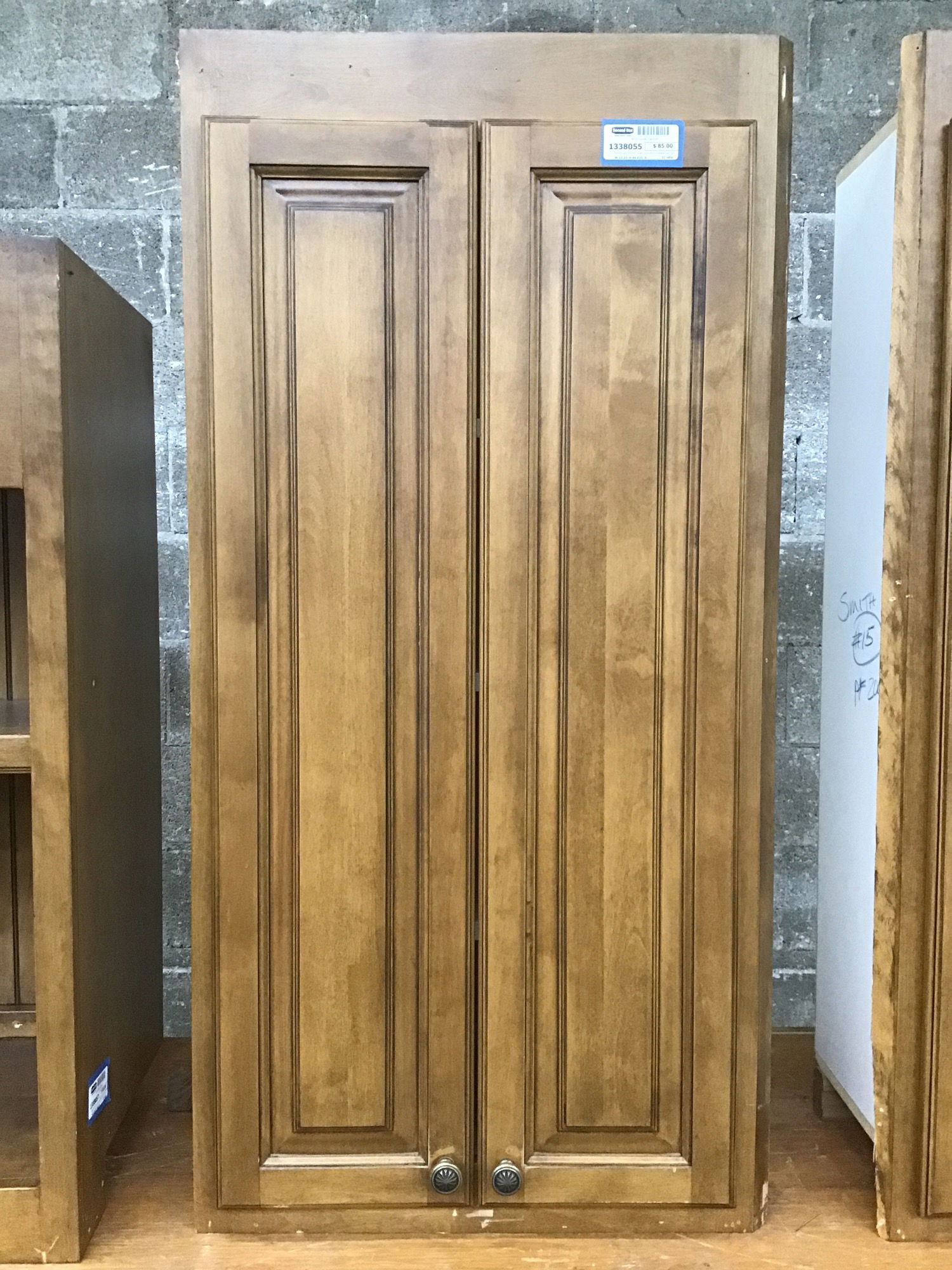Medium dark stained, raised panel birch (I believe) wall cabinet. Width listed is to the outside edge of the 45 degree bevel on the right side of the face.
