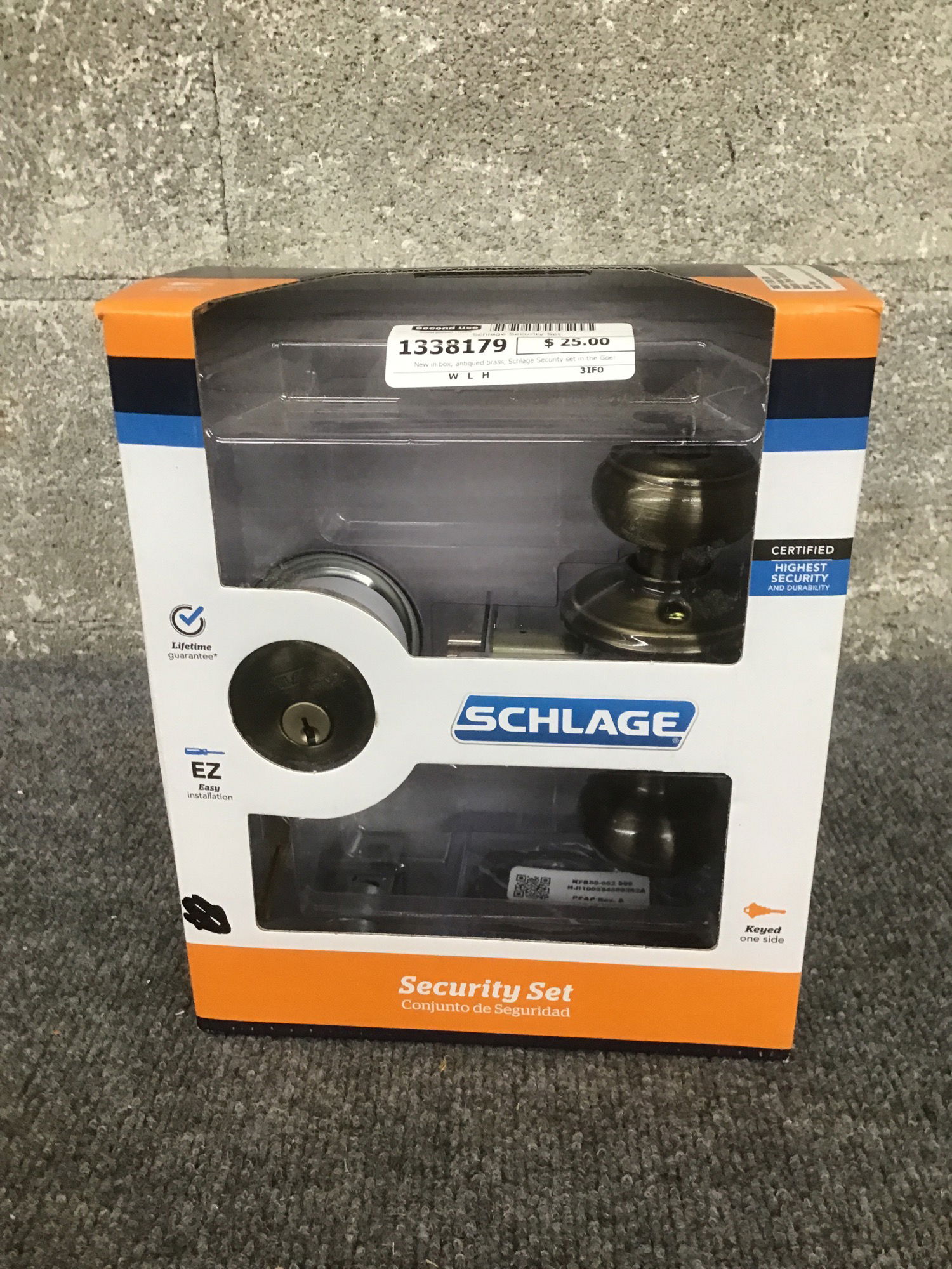 New in box, antiqued brass, Schlage Security set in the Georgian Style, appears complete with keys.