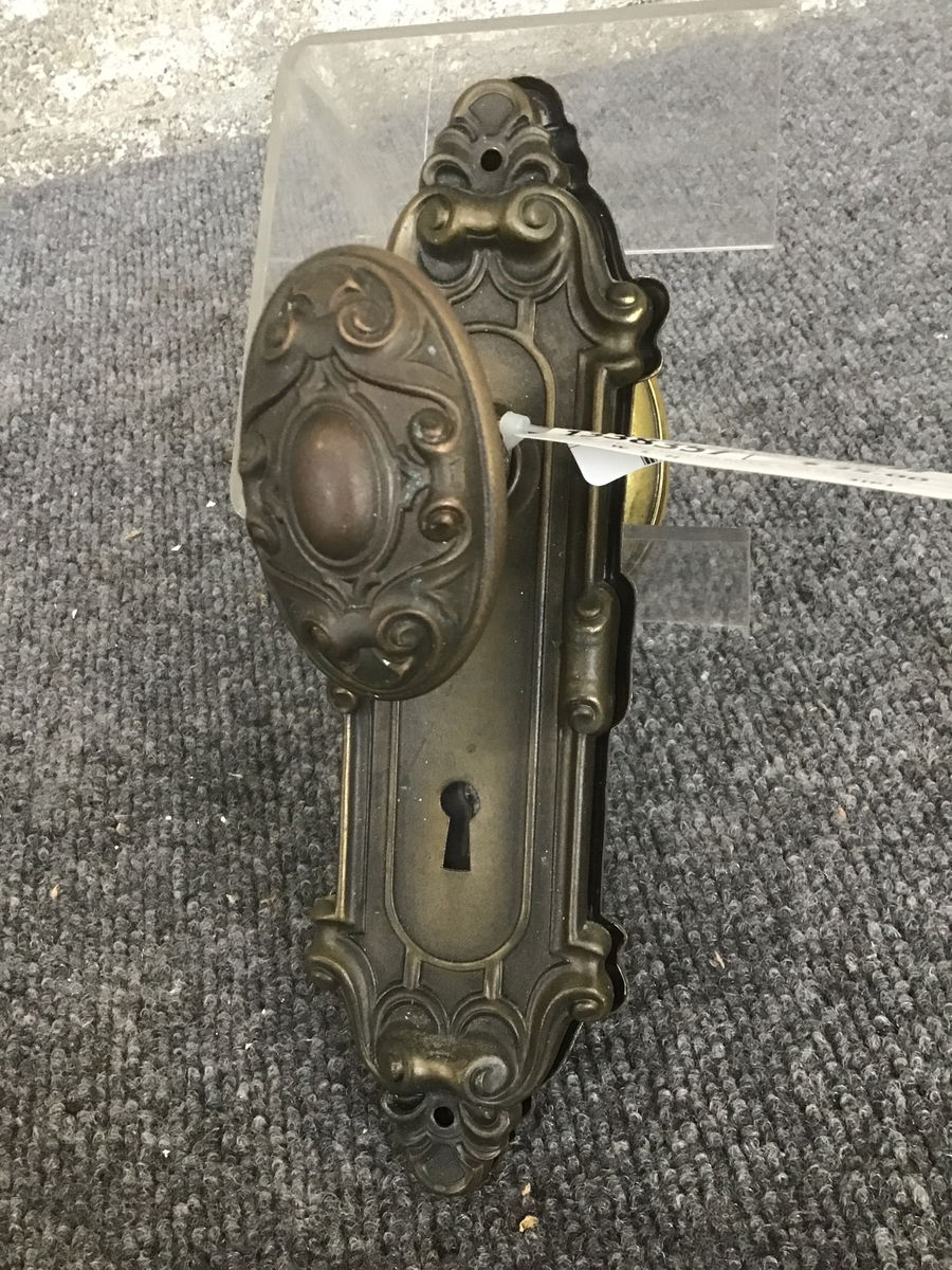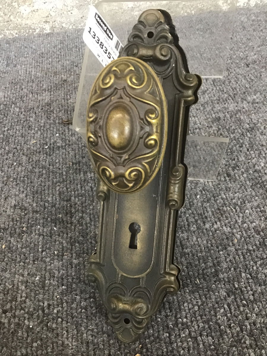 Pair of vintage knobs with swirling, scroll-like details that are matched on the door plates.