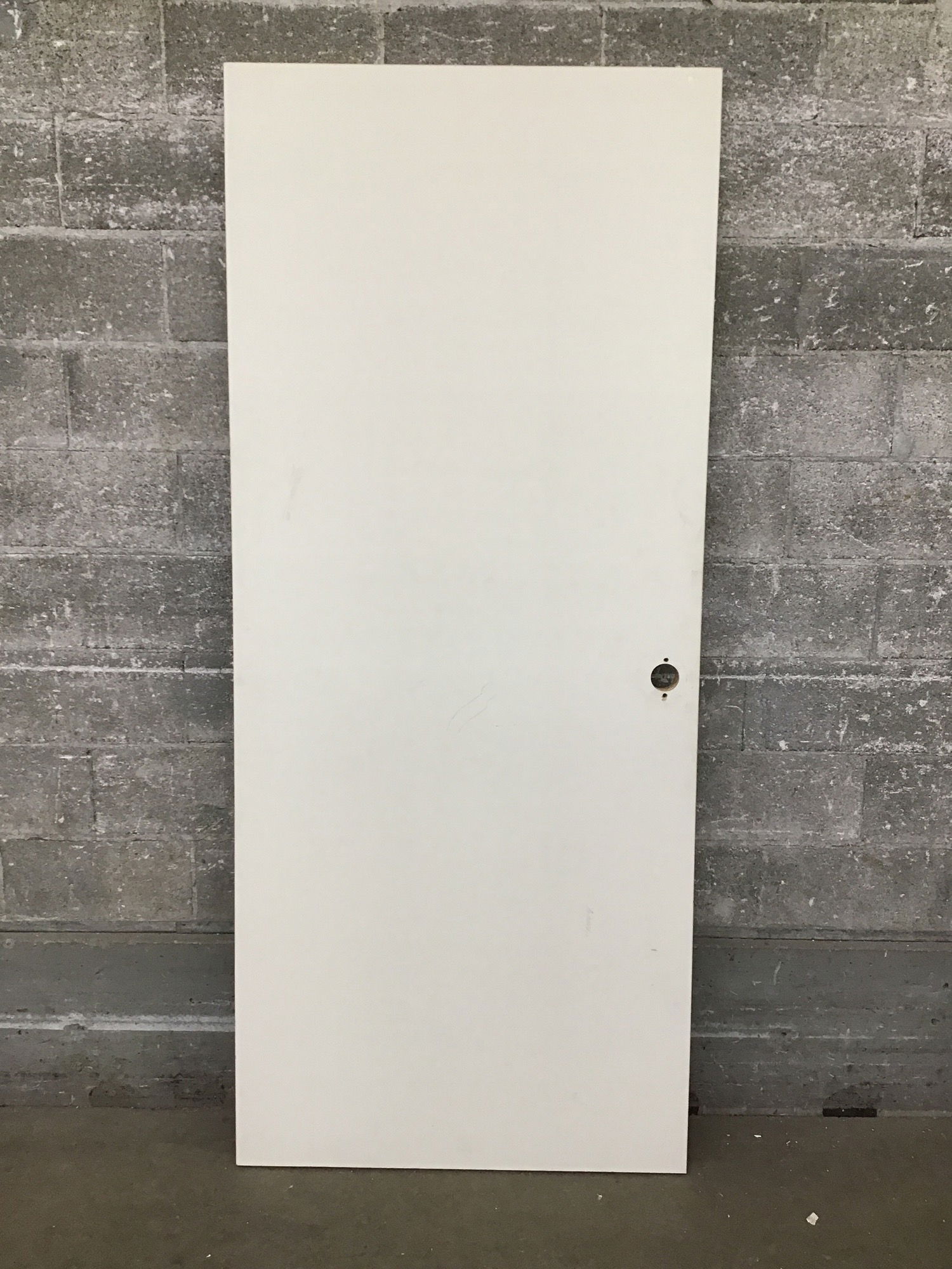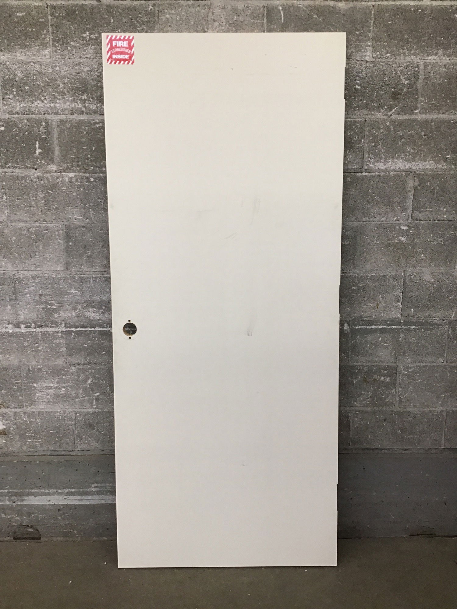 36" Commercial Interior Door Painted sold particle board. Has a "Fire Extinguisher Inside" stickers on one side. Has 3 hinge cutouts