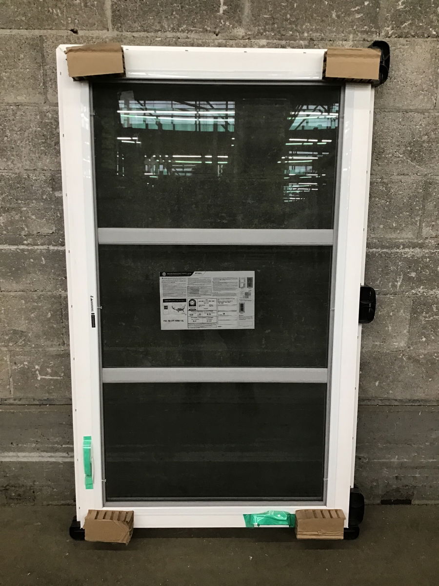 Mod look, faux three lite, ca. 2025 white vinyl window with energy tag. Item may have cosmetic damage.  Photo may be representational.