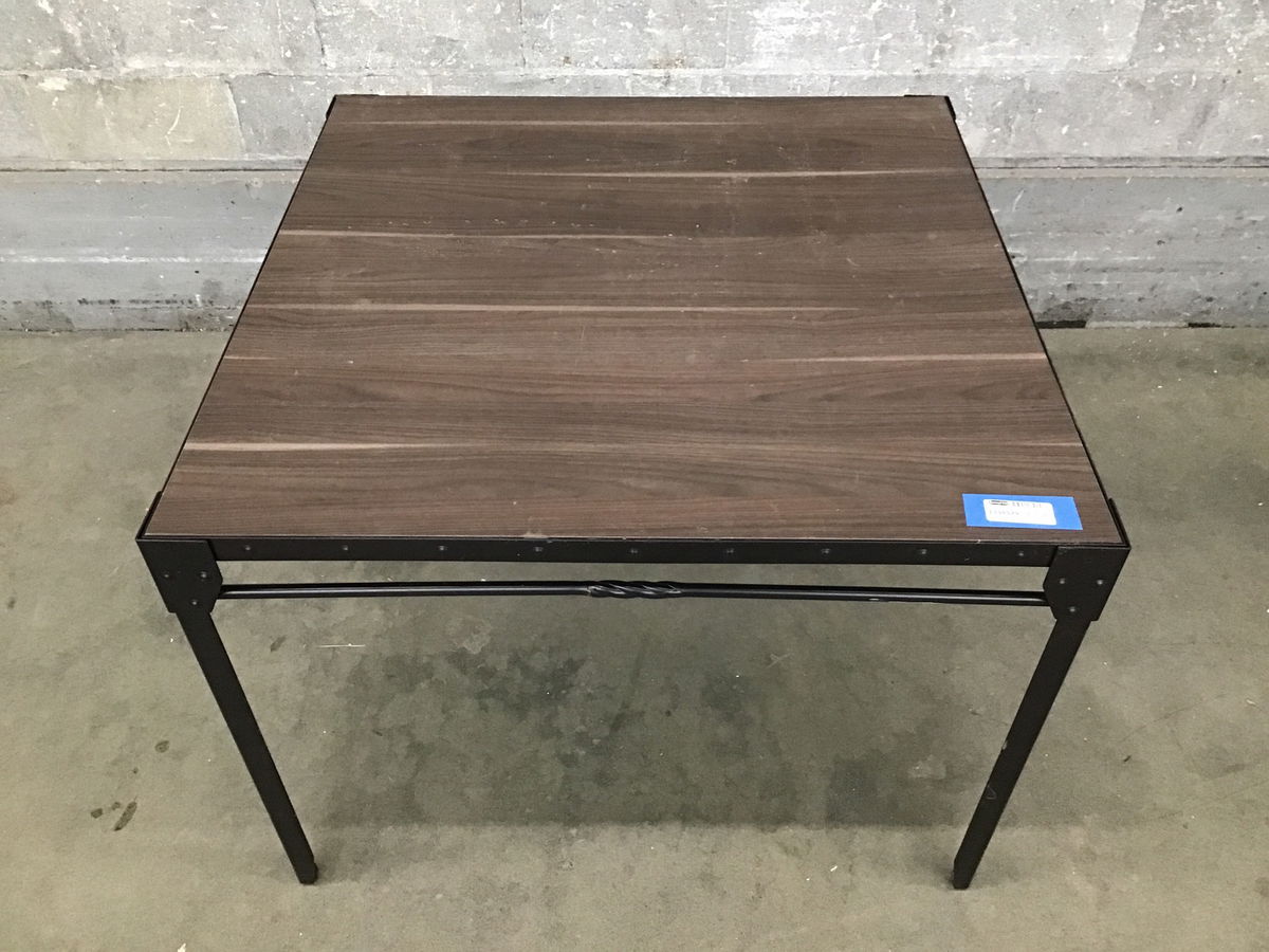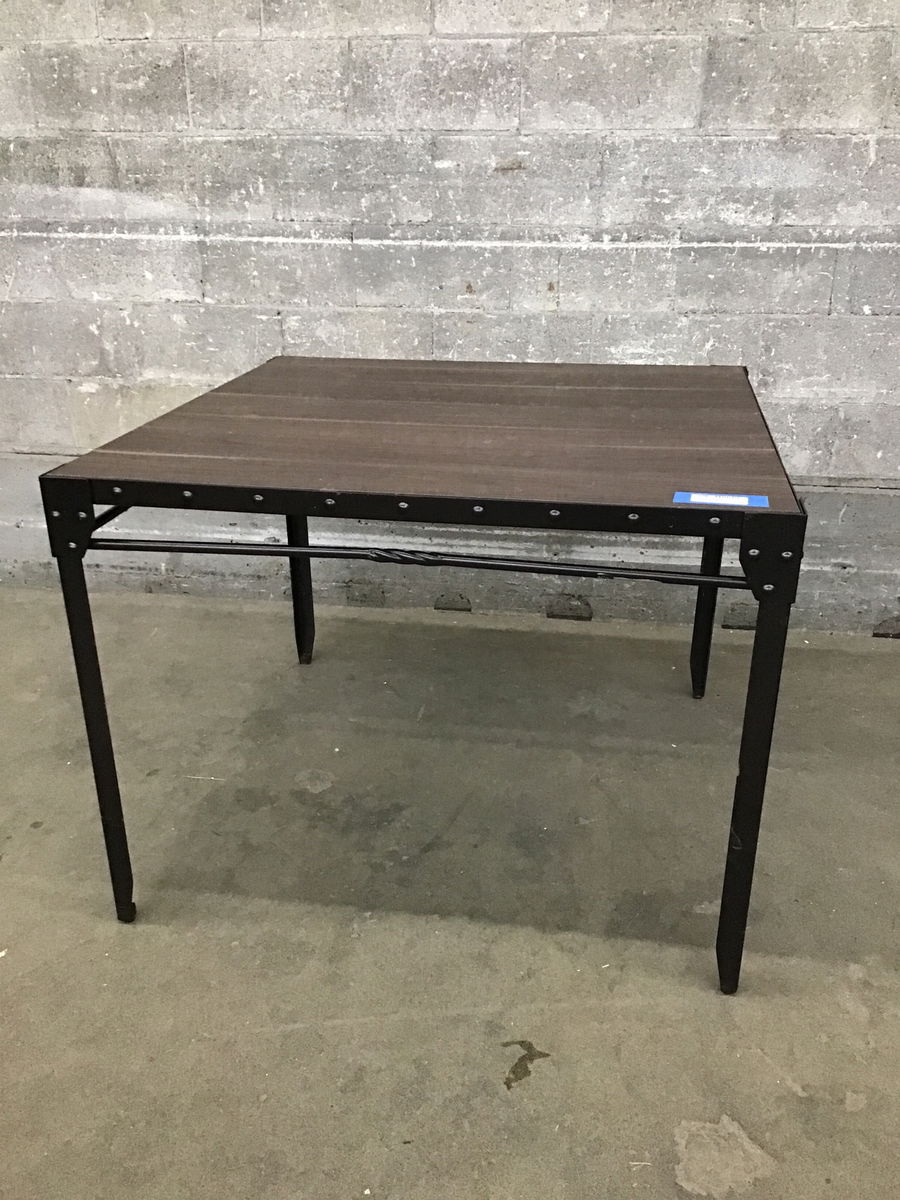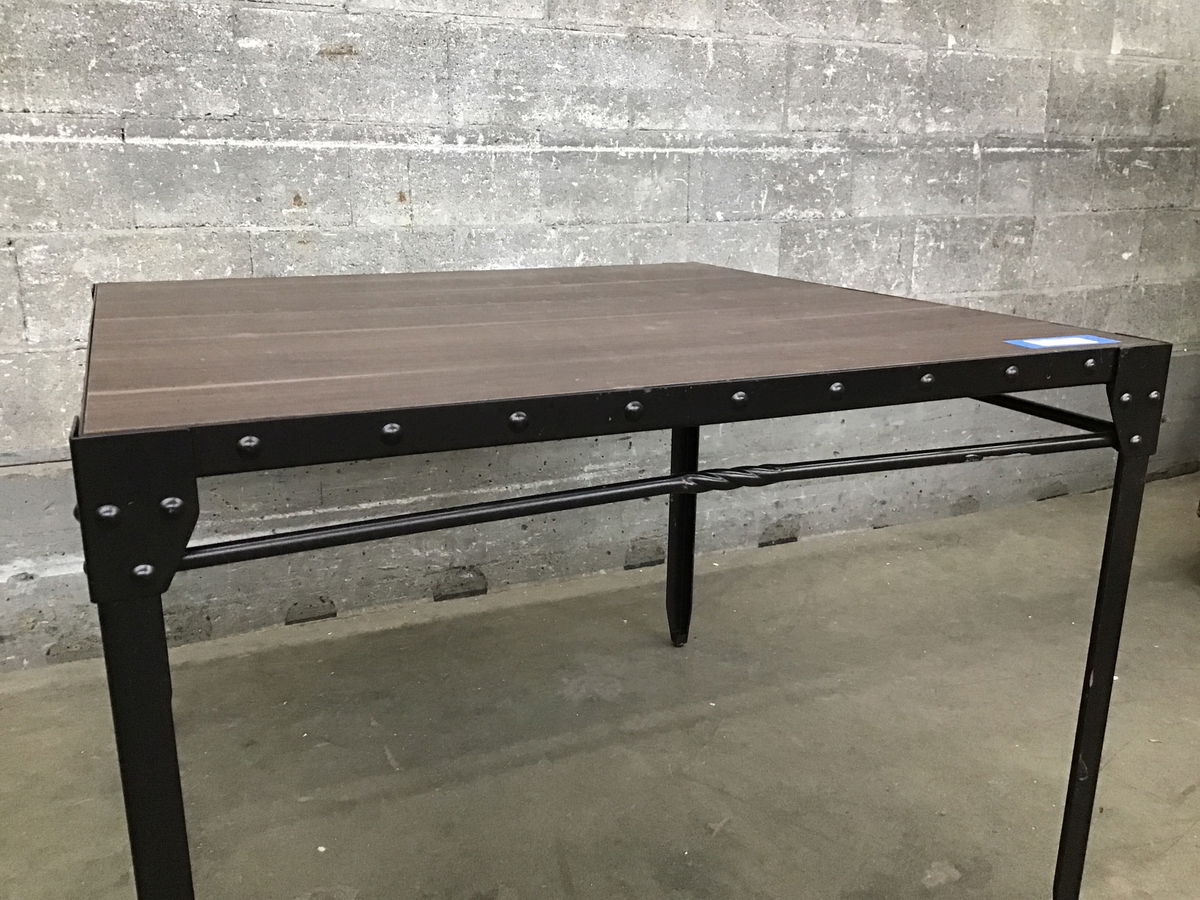 An industrial-chic dining table with "weathered" wood top (no splinters to worry about!) and fun riveted border. Very sturdy and in good shape overall, though two of the faux wrought iron cross bars have small cracks in the middle - doesn't impact the structure but price nevertheless reflects these defects.