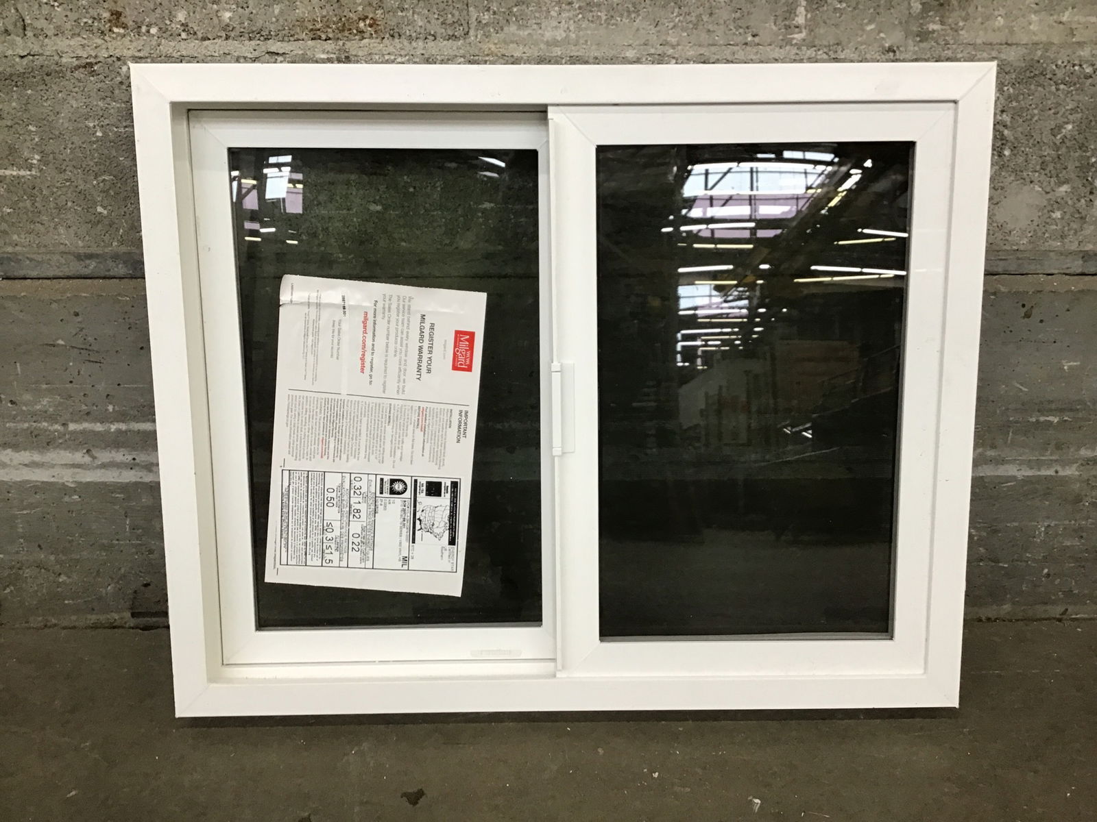 New, never installed Milgard vinyl slider with energy tags attached. Brown exterior/white interior.