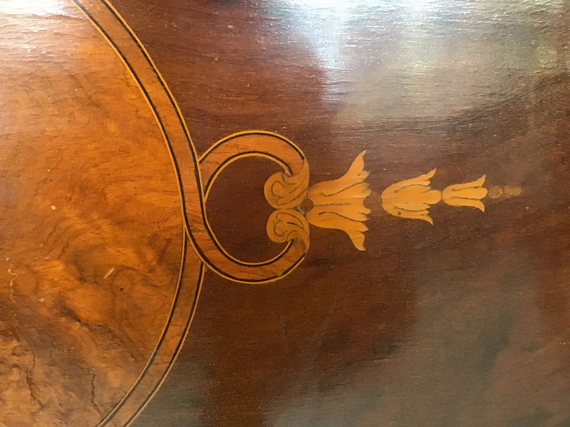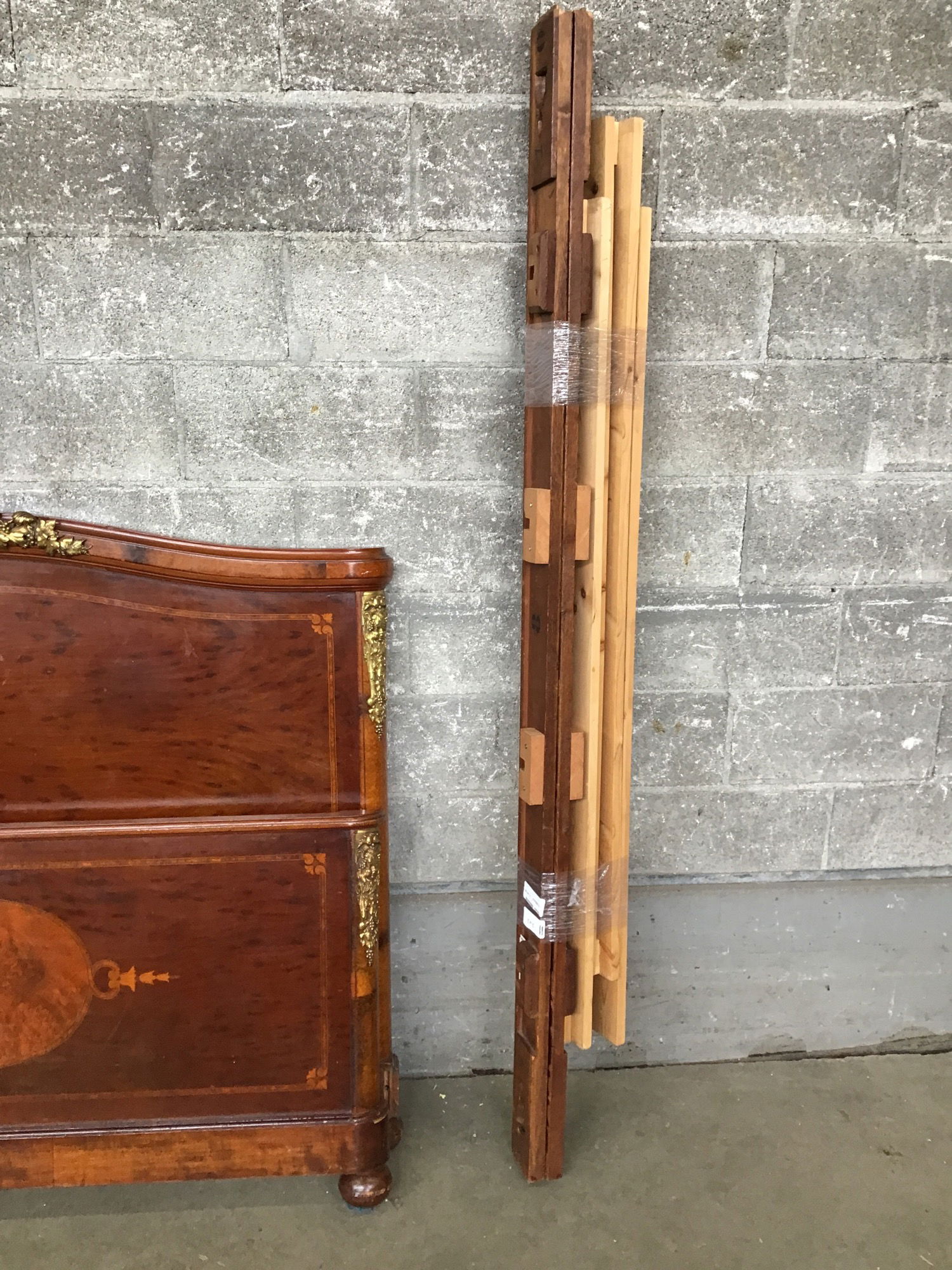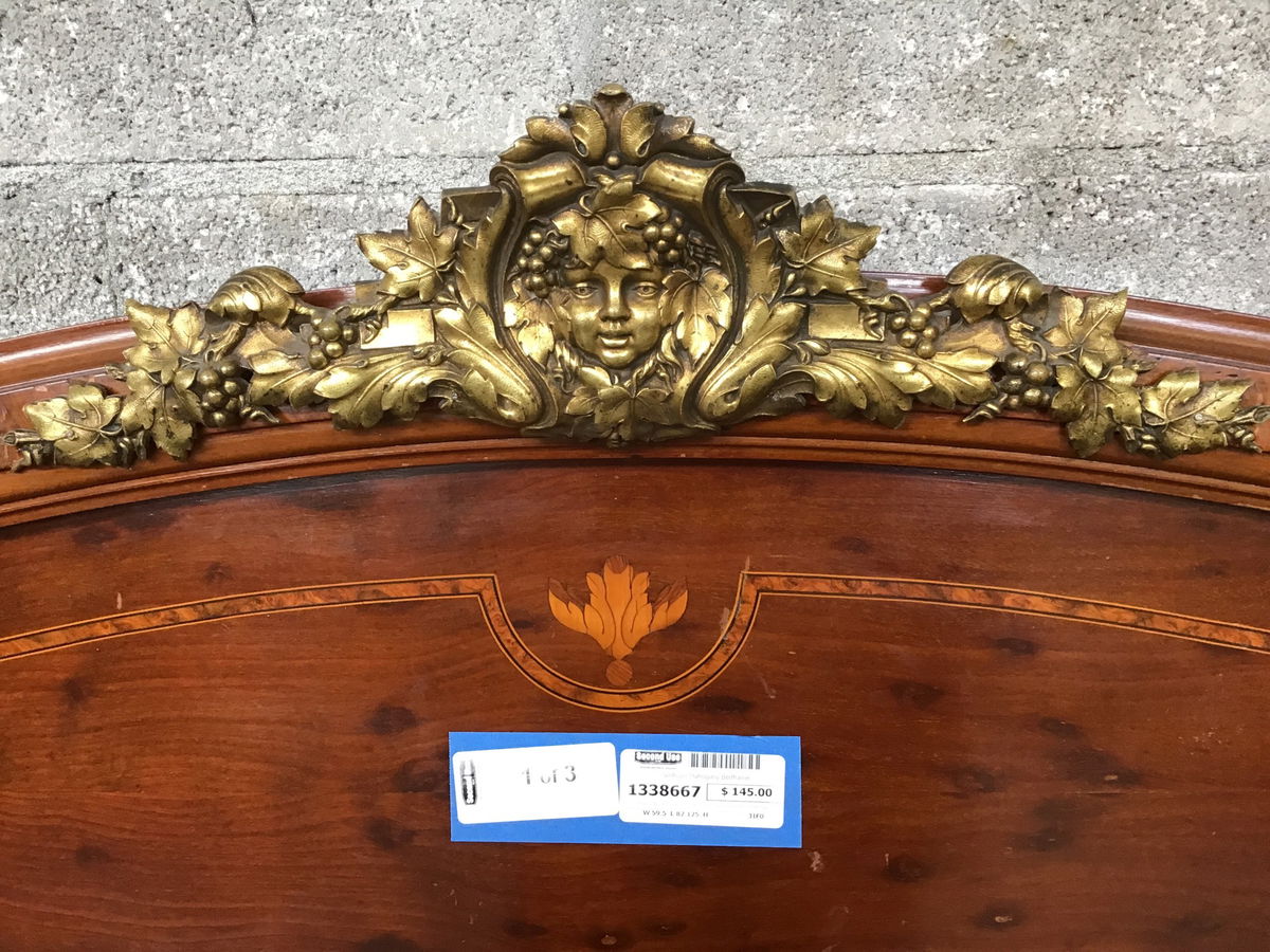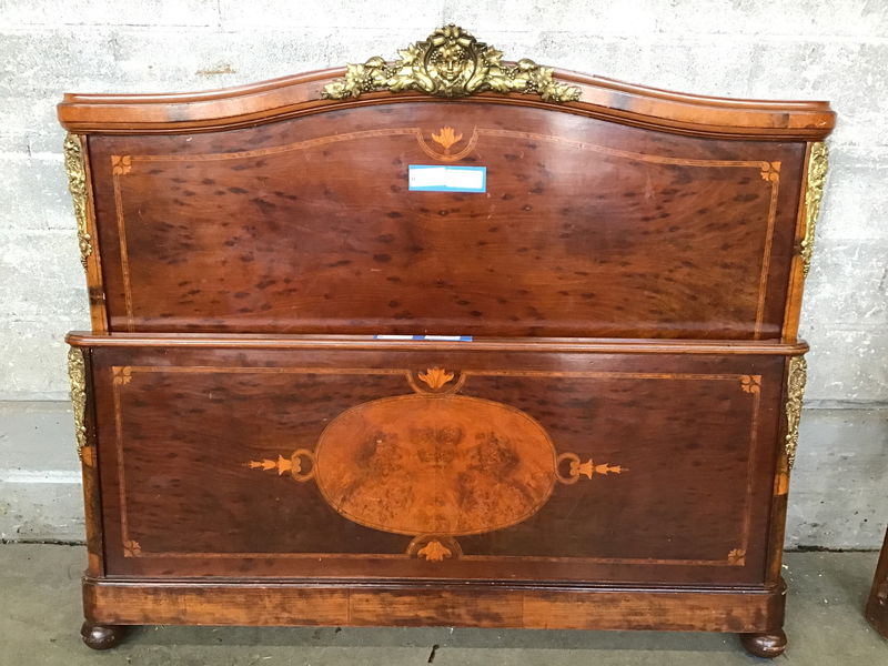 A stunning antique bed frame featuring bird's eye maple veneer with burl panels and ornate marquetry inlay. Finely detailed solid brass accents of scrolling vines, fruits, and Bacchanalian faces adorn each corner and the peak of the headboard. There is no maker's mark, but based on the stenciling on the backside of each piece as well as the construction methods, this piece easily dates to the very early 1900s if not even earlier! A more recent owner has evidently given the supports a revamp, as it came with some fresh braces and added reinforcements on the interior frame - no need to worry about wobbles!