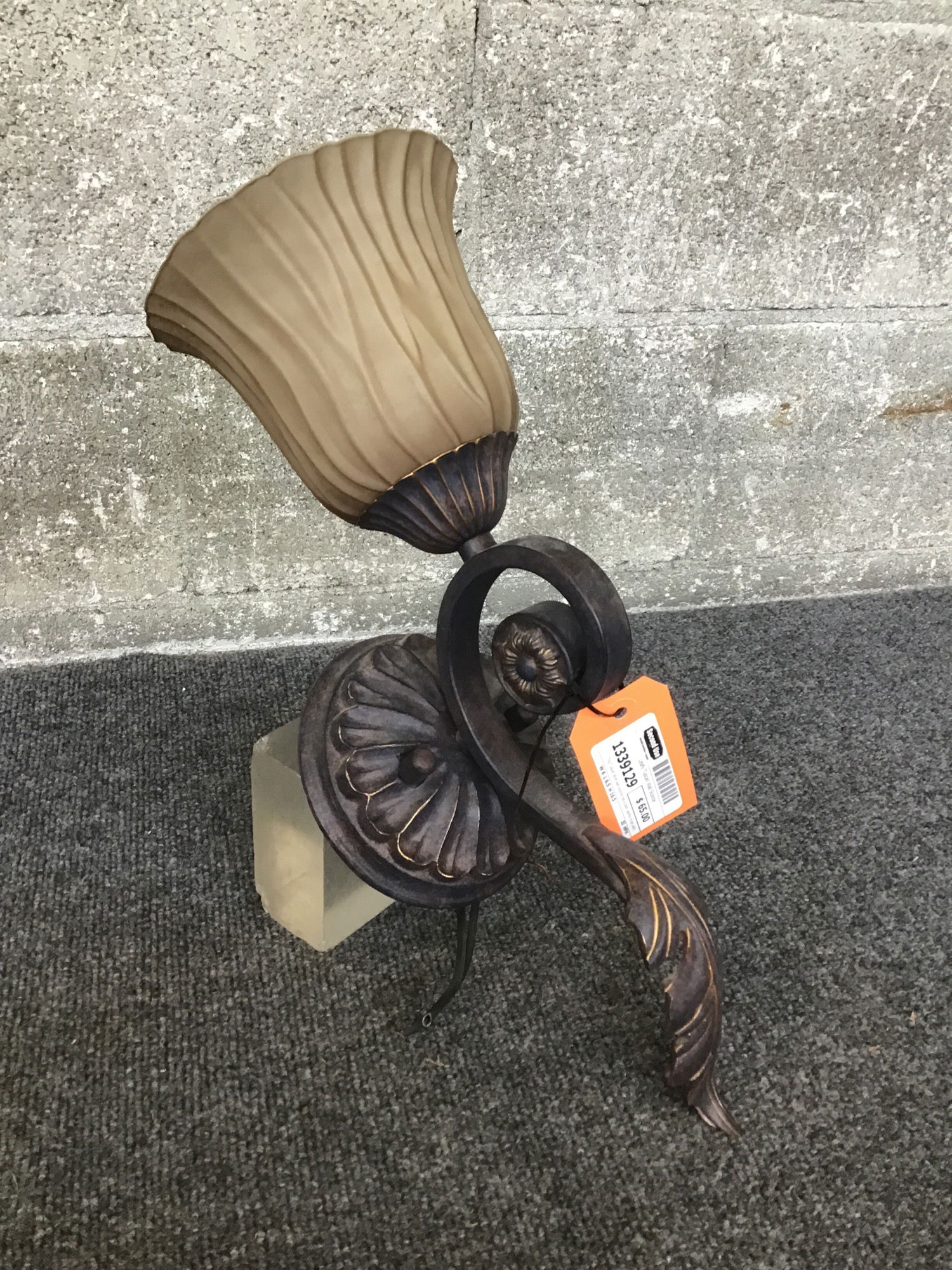 This Tuscan style wall sconce has a dark, earthy finish with a leaf detail at the bottom. The shade is interesting as it looks like the veins in a leaf as well, giving the sconce an organic feel.