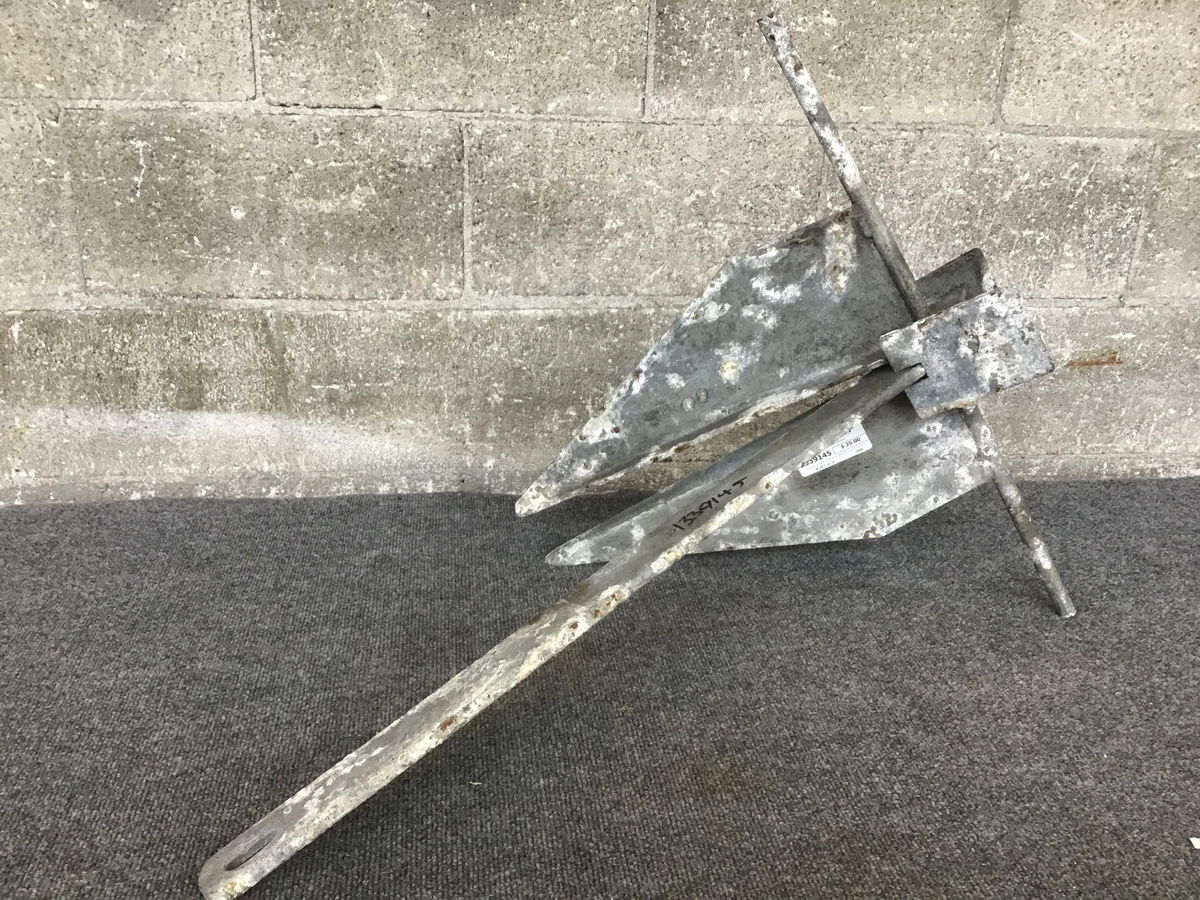 Seachoice anchor weighing about 18lbs (the shank is marked with 18) with a total length of 31in. Can't make any guarantees about its weight specs. Has definitely seen some use, seems to be in great shape though - just add water! And boat. And rope, if you want to use the anchor more than once...