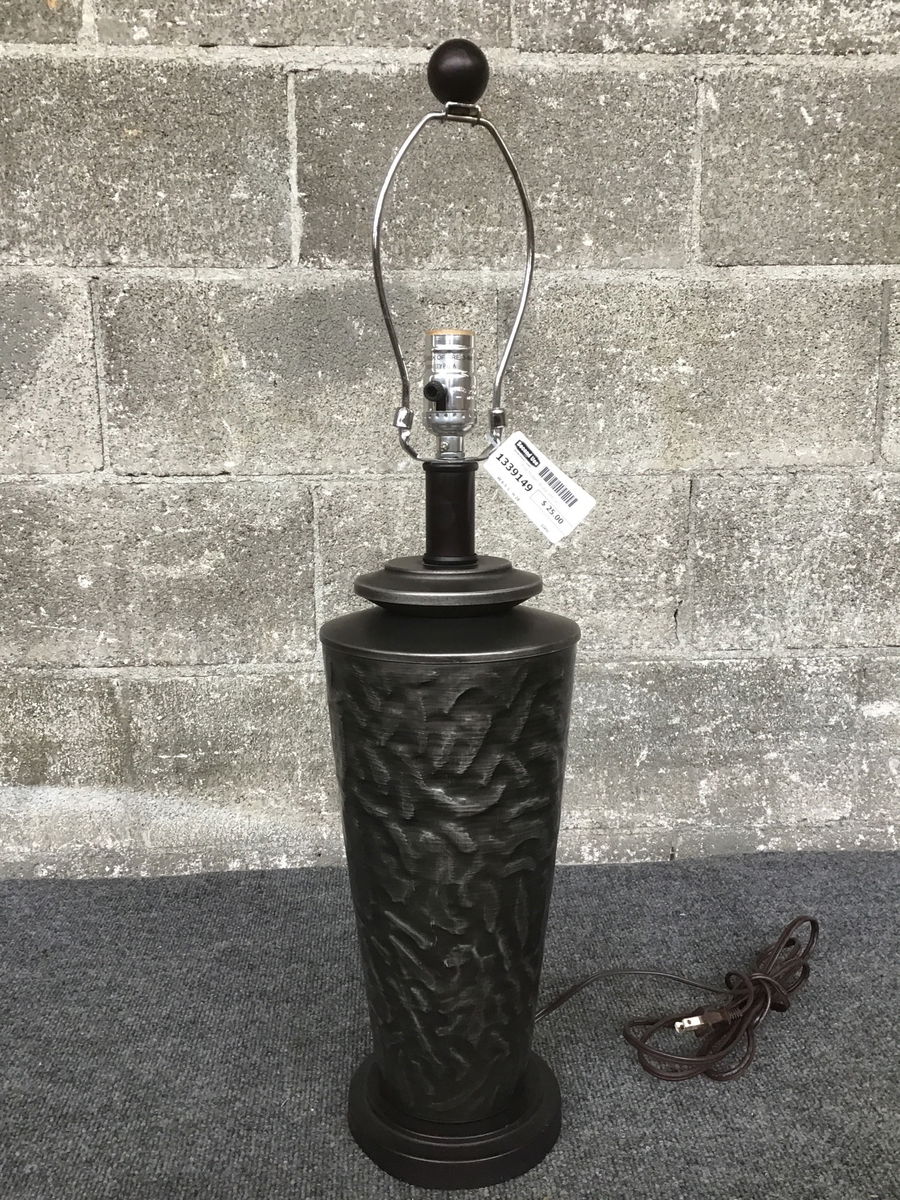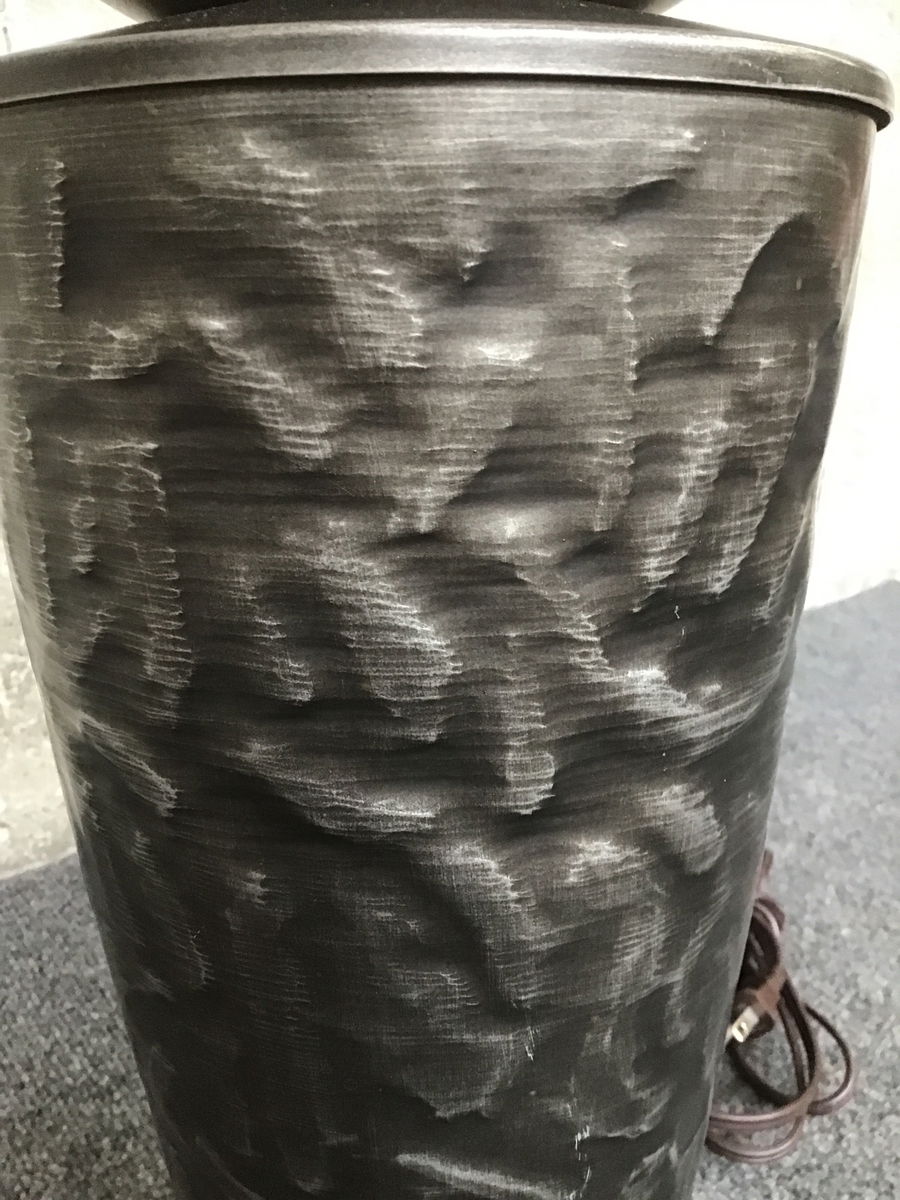 A fairly tall lamp with a sort of hammered-ish brushed metal surface that's like if someone whispered "brutalism" in the next room while this otherwise post modern object was being made... A little bit organic, a little bit industrial, a little bit geometric - just needs a funky shade and you're all set!