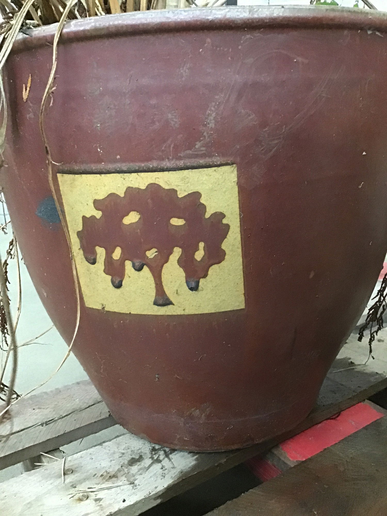 Dark reddish color glazed planter with embossed tree imprints. Dimensions are approximate.
