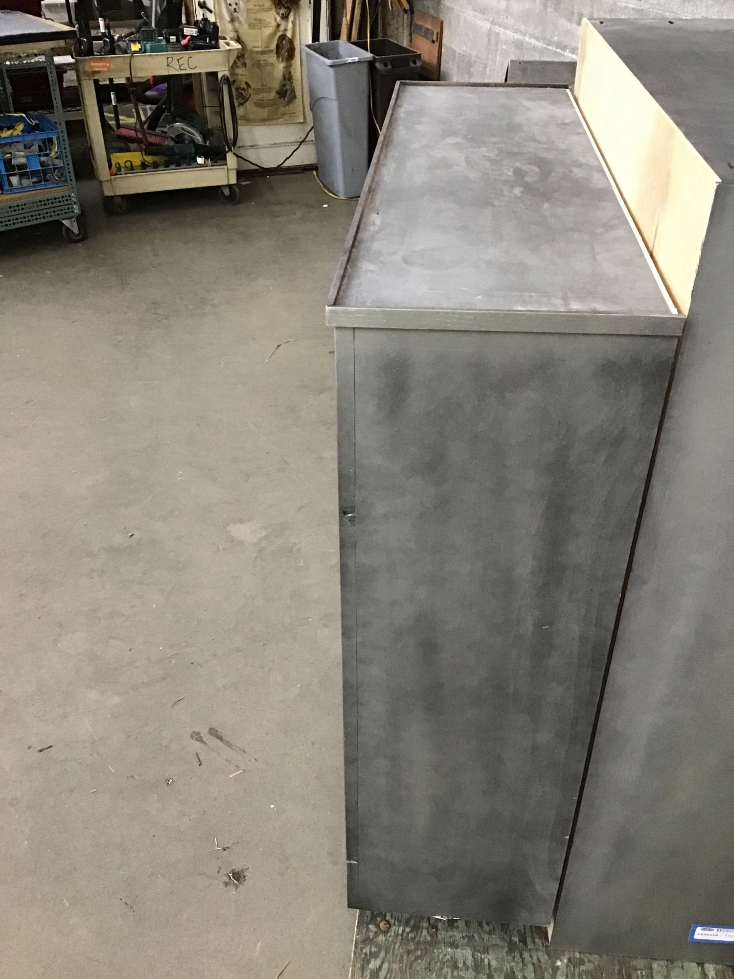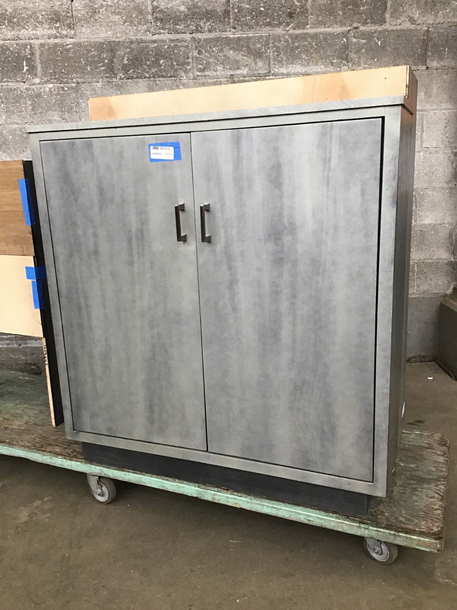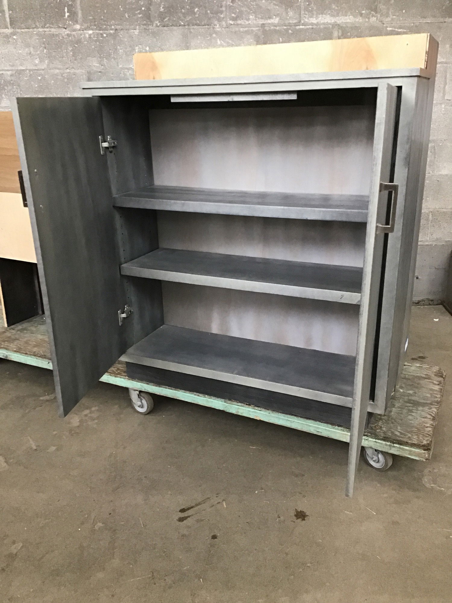 A big base cabinet with a silver paint job, two adjustable-height shelves, a pair of brushed nickel pulls and a configuration that looks like it may be a repurposed upper cabinet.