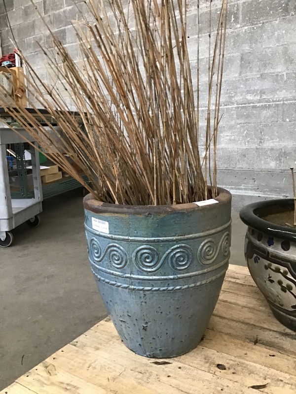 Blueish glazed planter on the larger side and with embossed wave design around the perimeter. Dimensions are approximate.