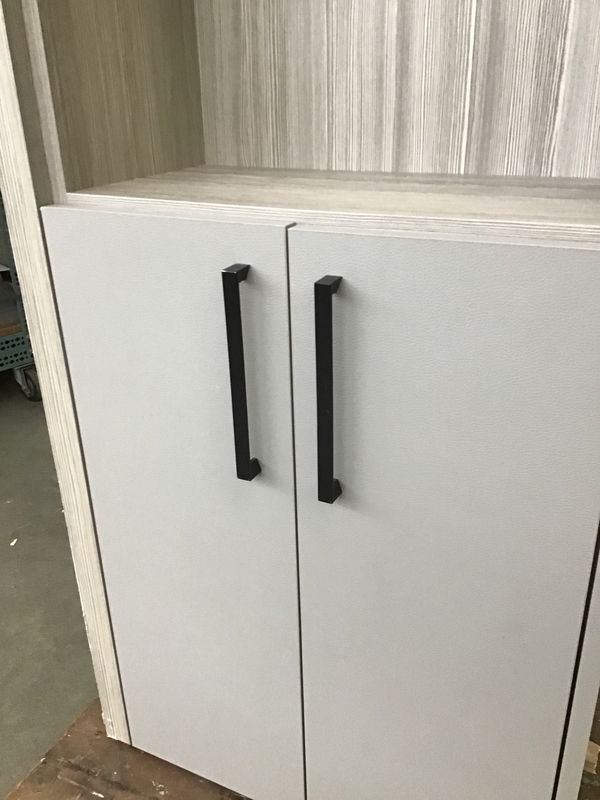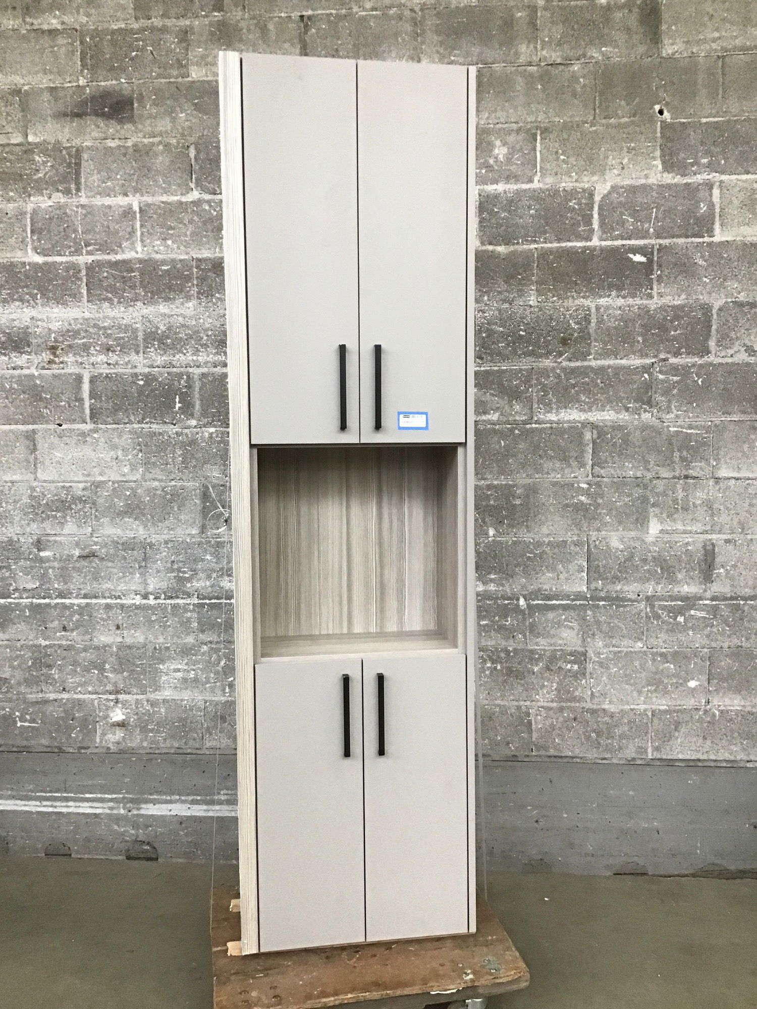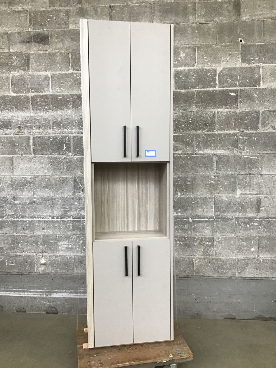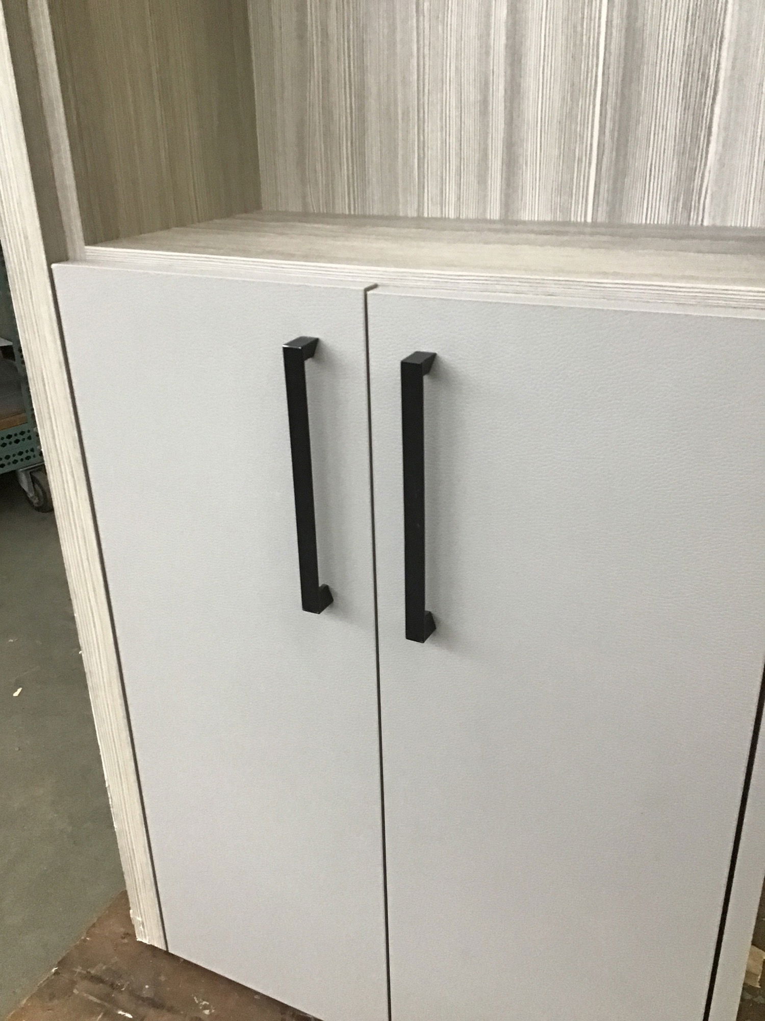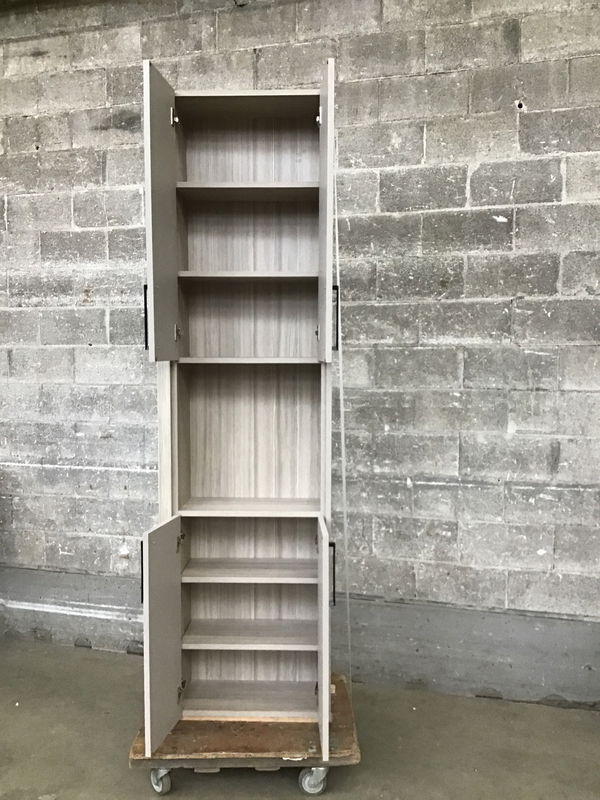 This cabinet was made to be used in a bedroom but no one is stopping you from using it elsewhere. Cabinet features a faux textured leather finish with a grey-washed laminate CVG fir interior. Has two storage spaces at the top and bottom that are behind two doors and there is an open space in the middle.
