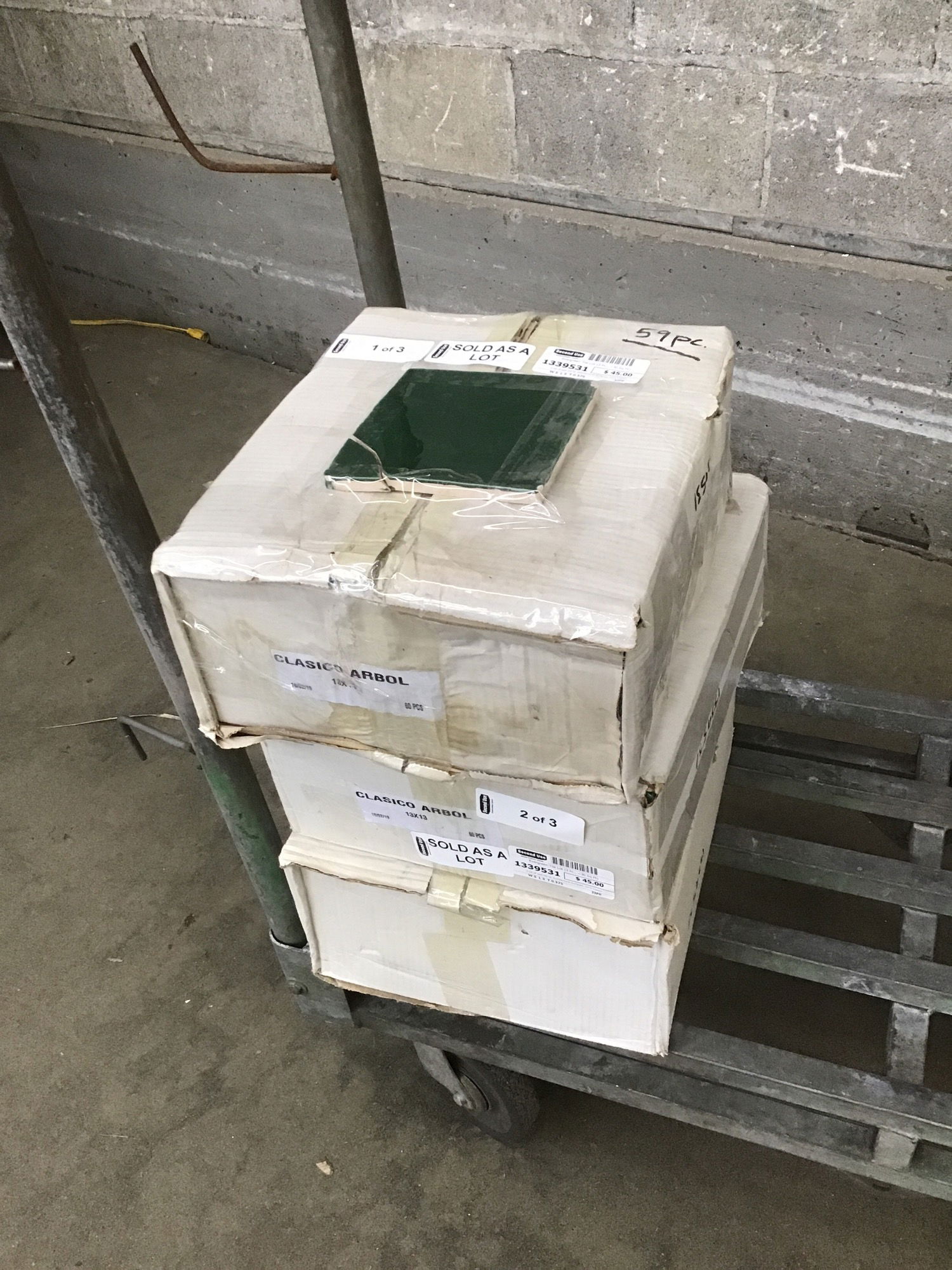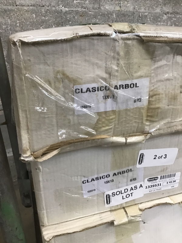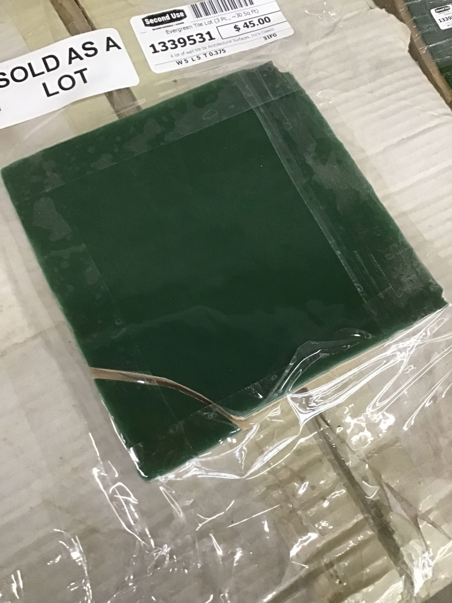 A lot of wall tile by Architectural Surfaces, Inc's Clasico collection in their Arbol Gloss finish, a deep, dark green that reminds me of the Olympic rainforest. There are three boxes, two of which hold sixty tiles (total around 10 square feet), while the last has 59 pieces (one of them broke but is provided as a sample piece), adding up to a total of around 31 square feet of coverage.