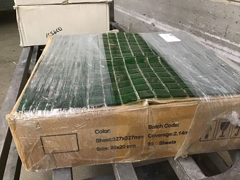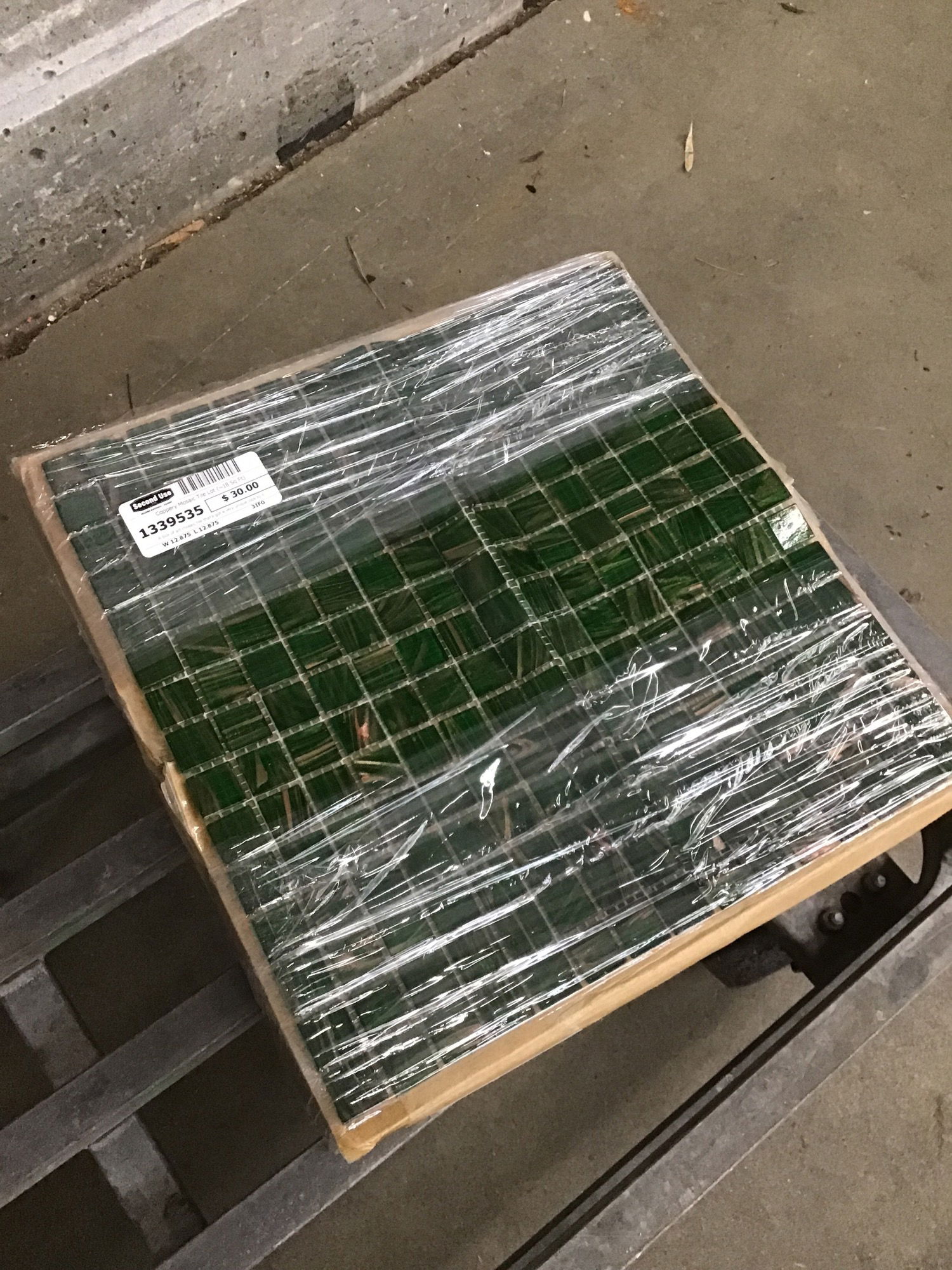 A box of art mosaic tile that's got a very unique look to it, almost like the lifespan of copper- it's a base green tone with streaks of coppery tone through it. There are 18 pieces total, each measuring roughly 1 square foot.