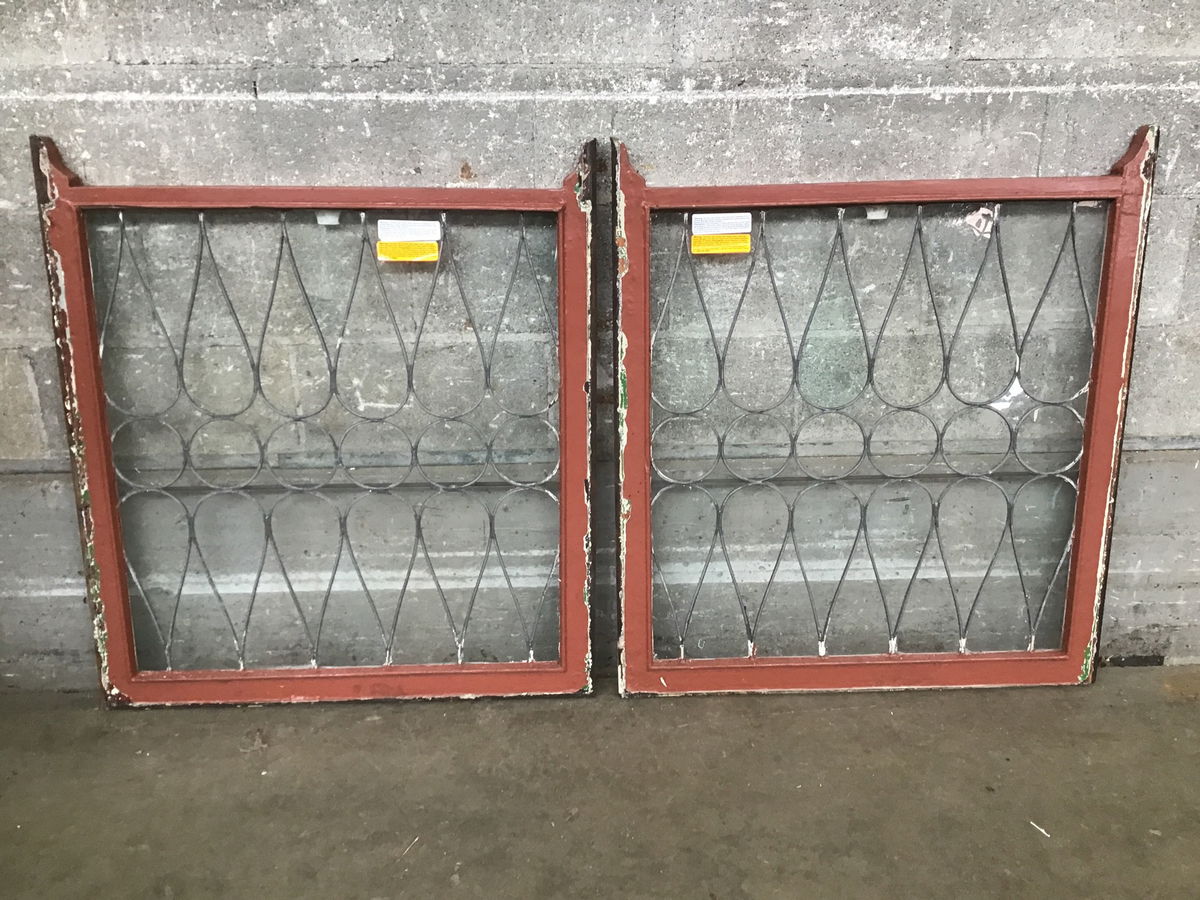This delightful vintage wooden window sash pair each feature 46 transparent true divided wavy glass cut into triangular/diamond shapes and circular/tear drop shapes. The placement of the glass here really draws the eye all around in a playful yet not disorienting fashion. These would look excellent in a space made for indulging in freindly company with lots of tasty confections around!