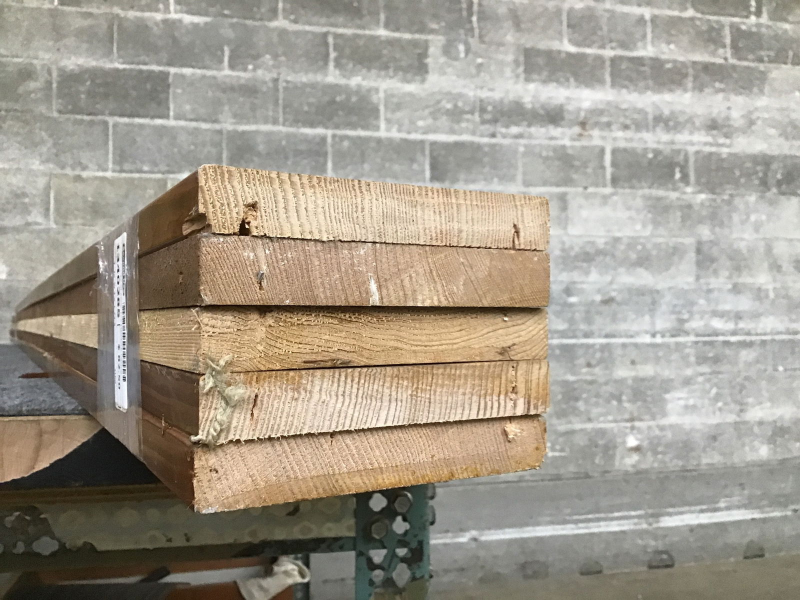Five pieces of clear 1x5 hemlock, most of which is stained on three sides. Lengths range from that listed to just shy of 8'. This material was reclaimed from a Craftsman style home.