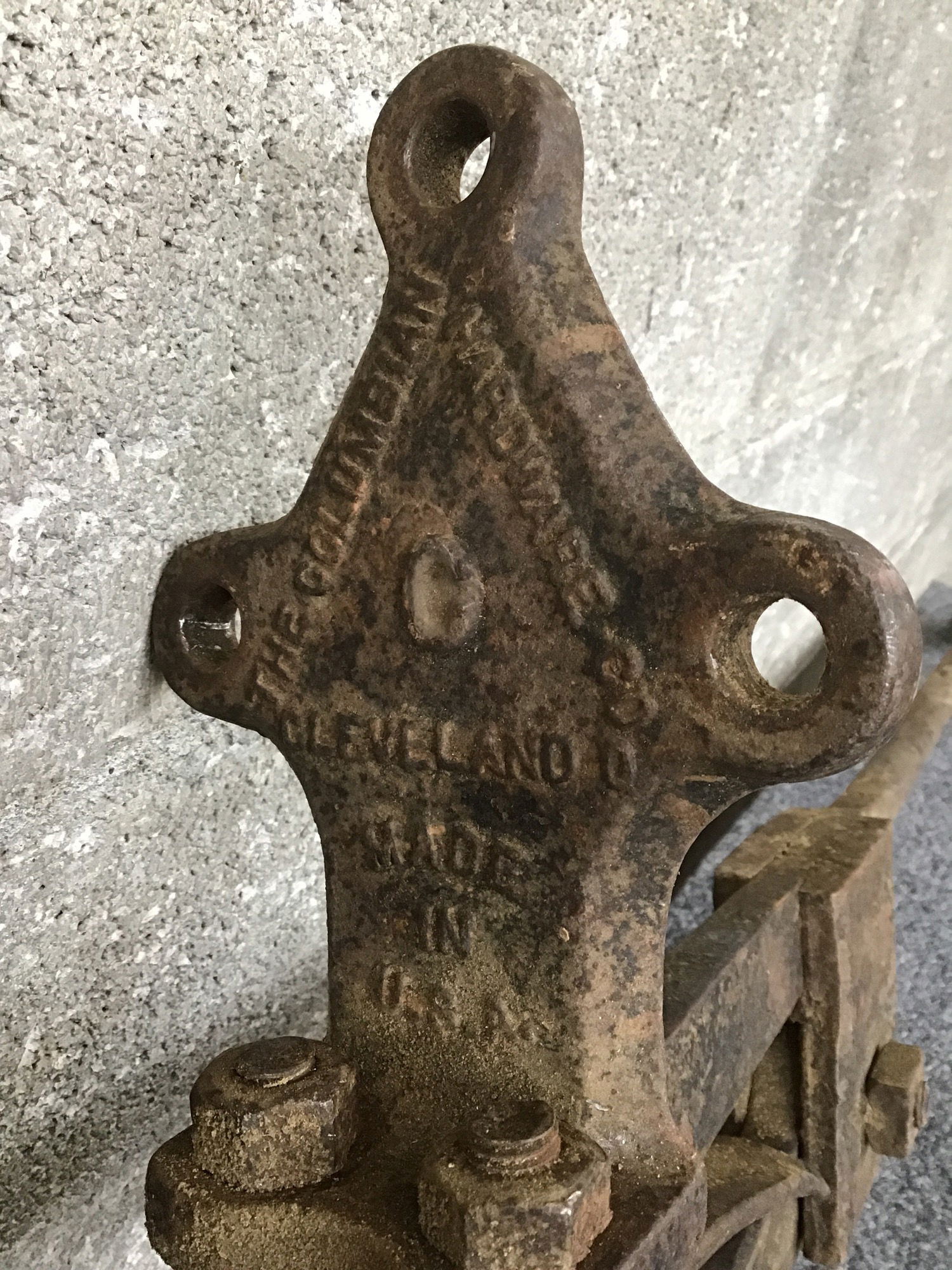 Vintage post style blacksmithing vise made by the Columbian Hardware Co. of Cleveland. The 5" jaws have a few good pits in them, but it's still working just as it should. It seems as though it's been well cared for and has tons of life yet to live.