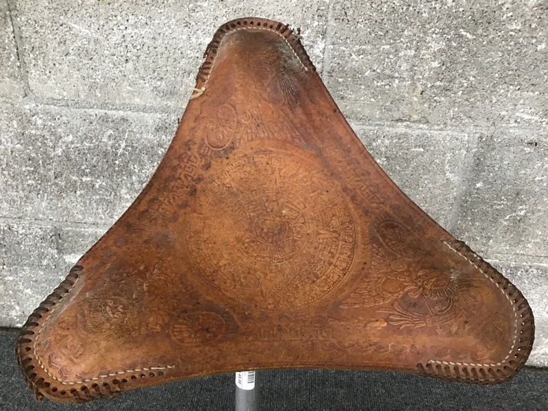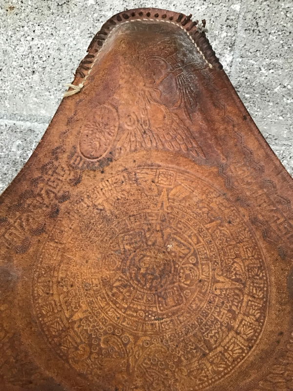 This little stool features an Aztec calendar at the center of three figures, supported by three hollow aluminum legs. The decorative leather stitching on the "corners" is a little rough and rowdy, but don't let that discourage you. As far as camp stools go, I've never sat in one that felt nearly as comfortable as this.