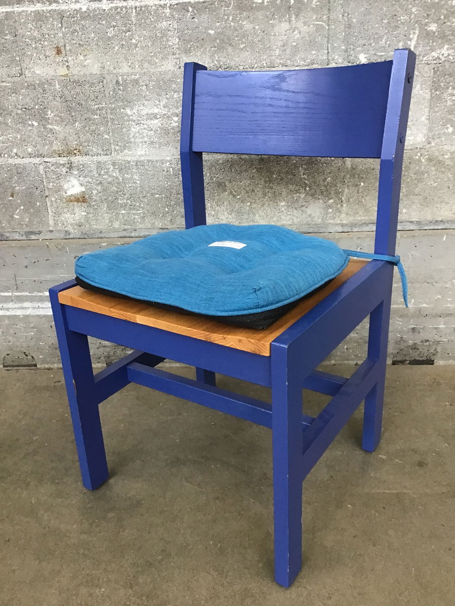 Stout n' sturdy solid Oak chair painted a cheerful periwinkle with a natural Oak seat. Includes a blue cushion. Photo may be representational.