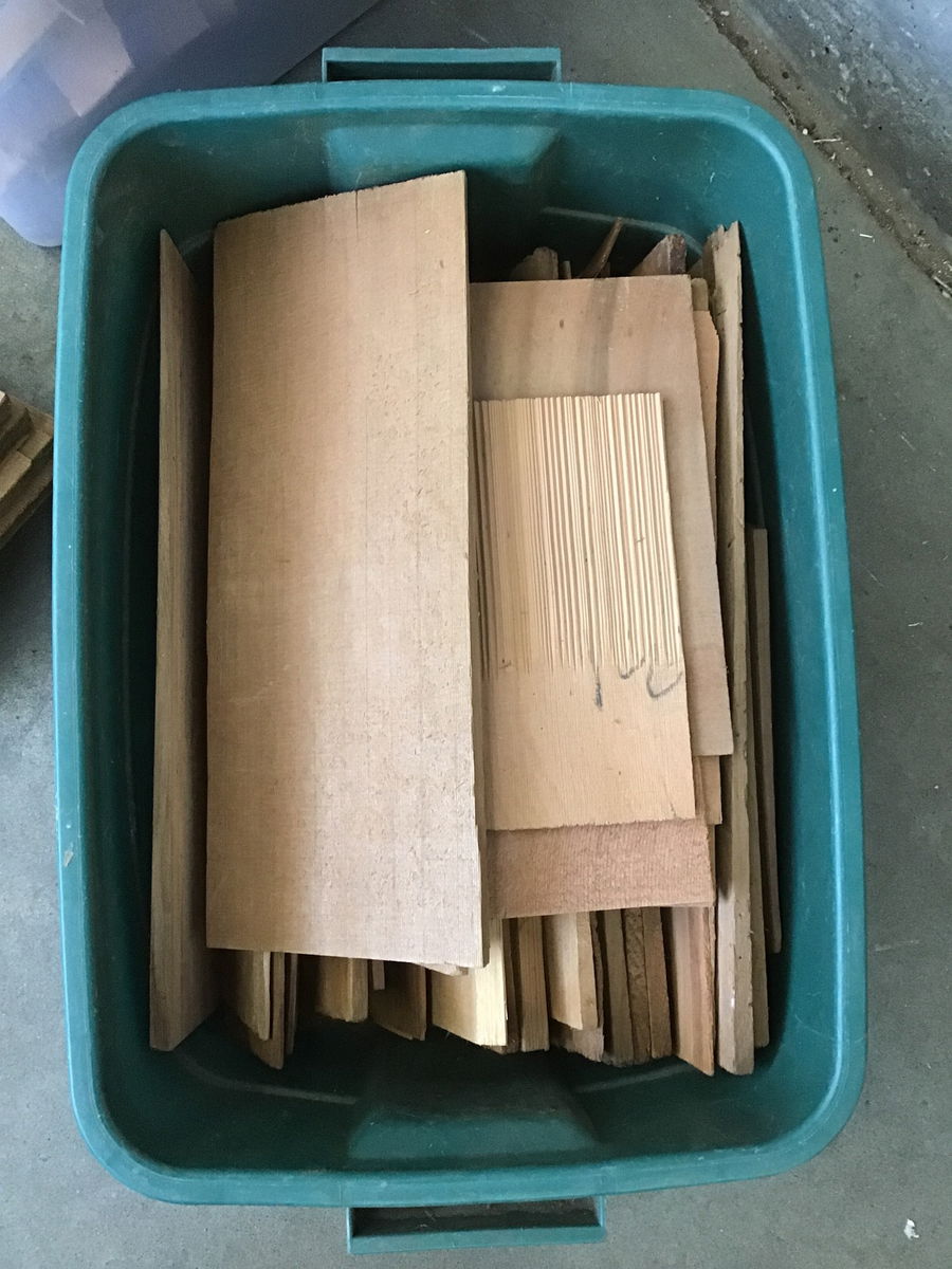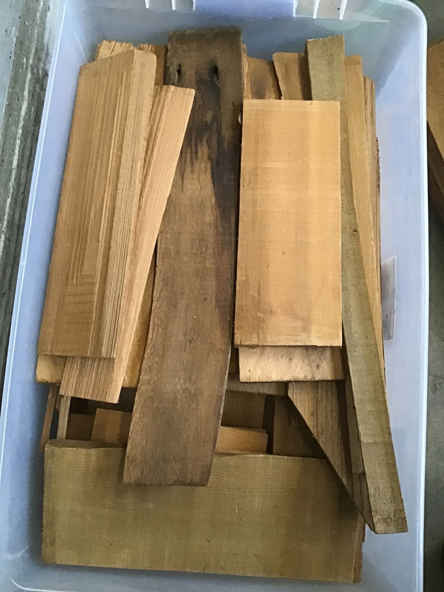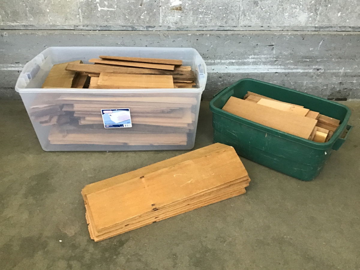 This lot of two plastic tubs of cedar shake and eight ridge caps would be perfect for a dog house or some other small, rustic structure. These are definitely a mixed bag of leftovers - widths, lengths and thickness varies. There are a couple pretty thick, clear pieces in the mix and a lot of thinner material as well.