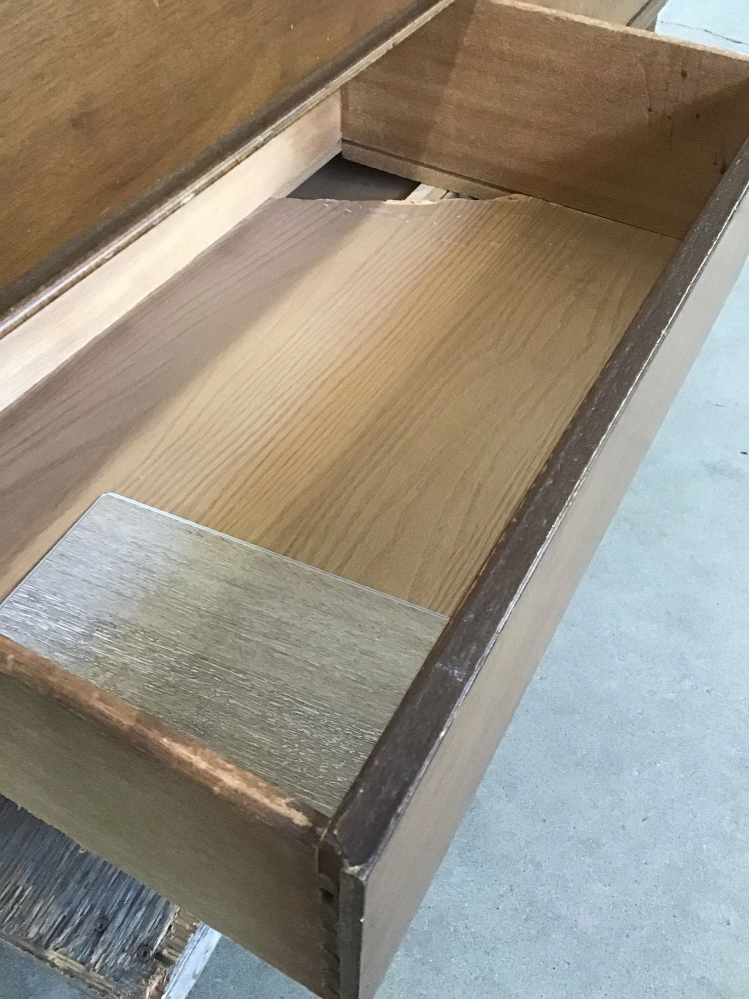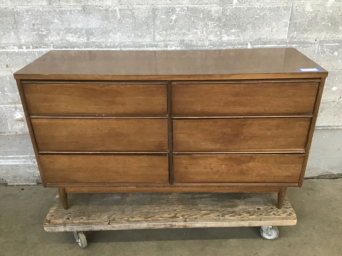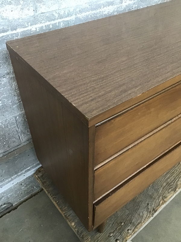 Mid-Century Walnut faced dresser with Mahogany laminate top. It's got great lines and is in decent condition aside from a small chunk missing from the bottom of one of the drawers.
