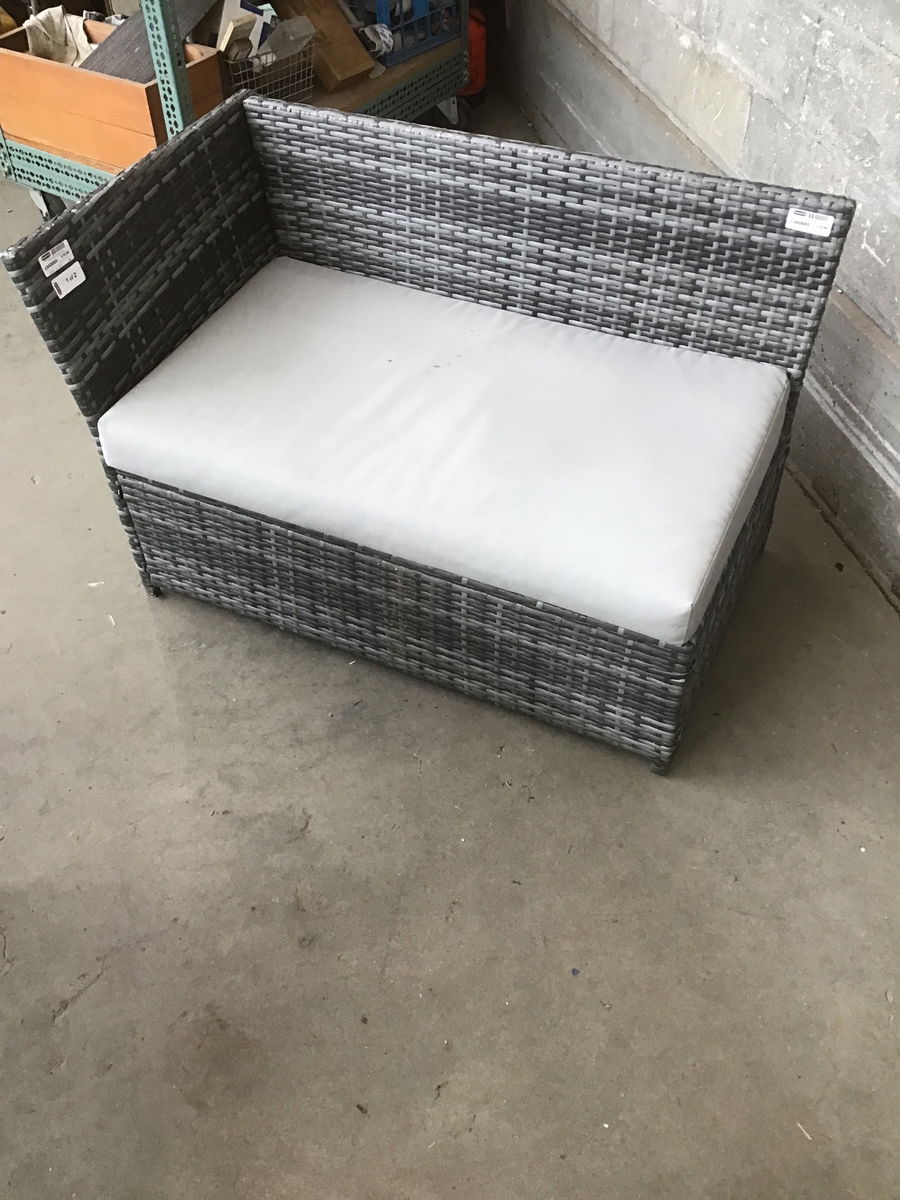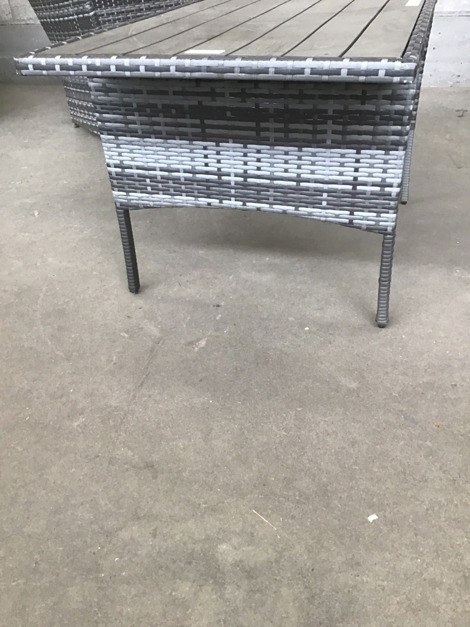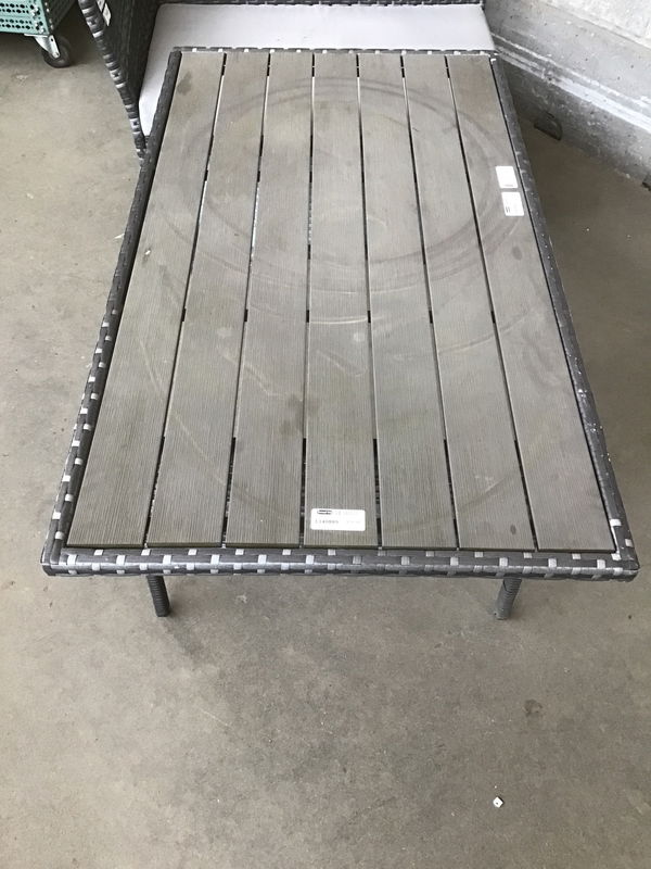 This is a combo of a patio table and chaise lounge that are made from a woven plastic material that is weatherproof. The lounge comes with a cushion. Dimensions listed are for the table, the lounge is: 42"L x 25"W x 28"H