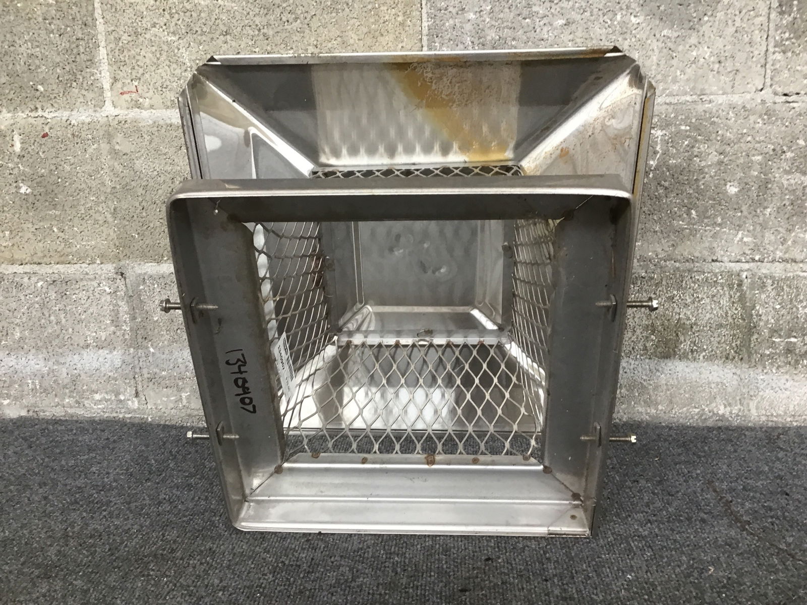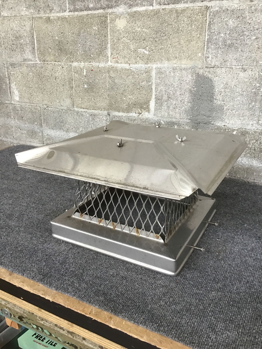 Stainless steel chimney cap that looks like it was stored for many years but never installed.